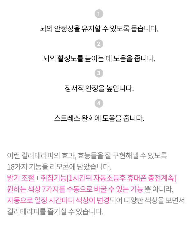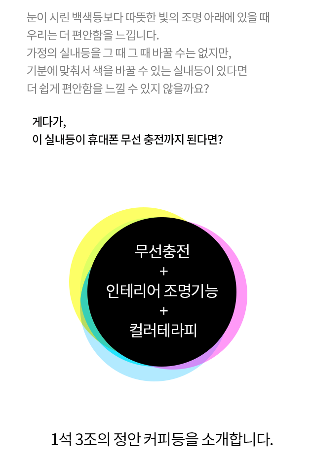 휴대폰 무선충전 기능과 행복감을 불러일으켜 주는 컬러테라팅 특수조명으로 건강하고 행복한 공간에서 생활하세요