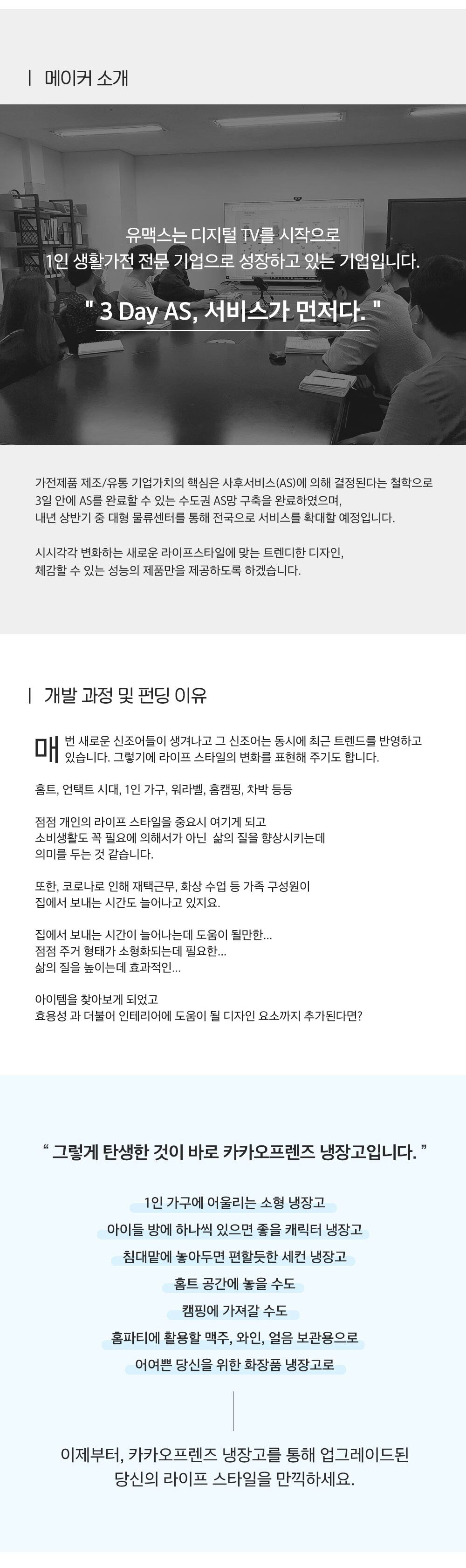 안녕하세요, 카카오프렌즈 냉장고 메이커 유맥스입니다. 와디즈를 통해 저희가 야심차게 준비한 프로젝트가 오픈하게 되어 대단히 기쁘게 생각합니다. 서포터님들이 사랑하는 카카오프렌즈 캐릭터 어피치와 라이언이 여러분의 일상에 작은 활력이 될 수 있었으면 좋겠습니다.