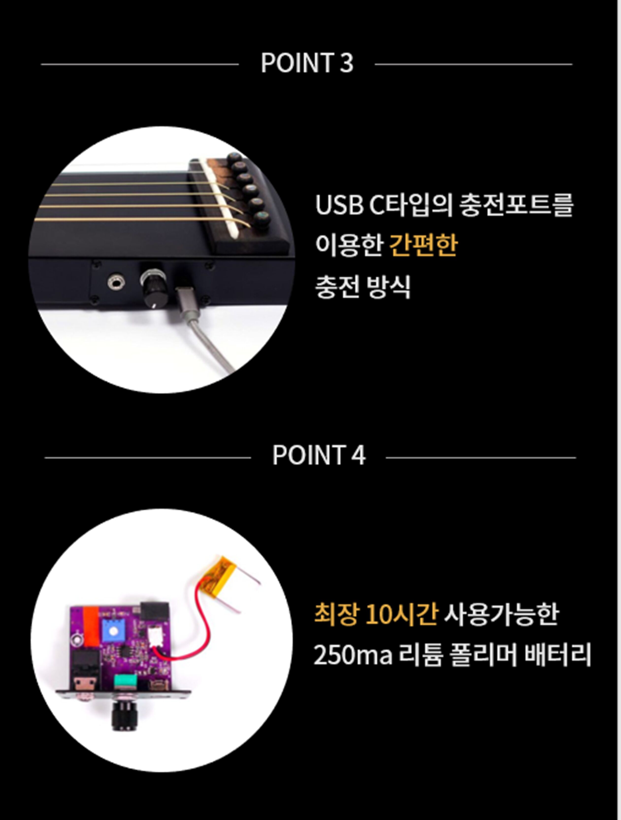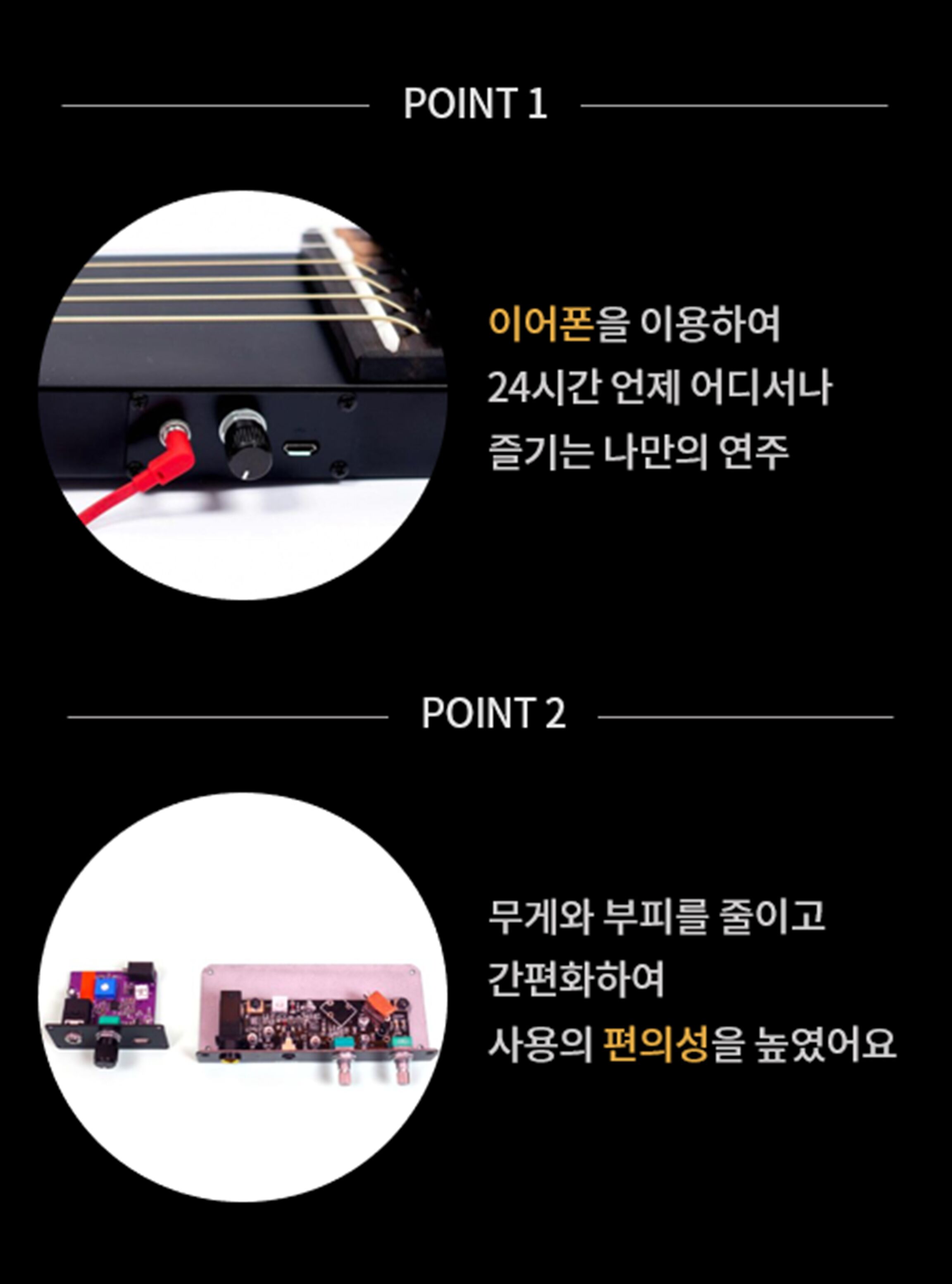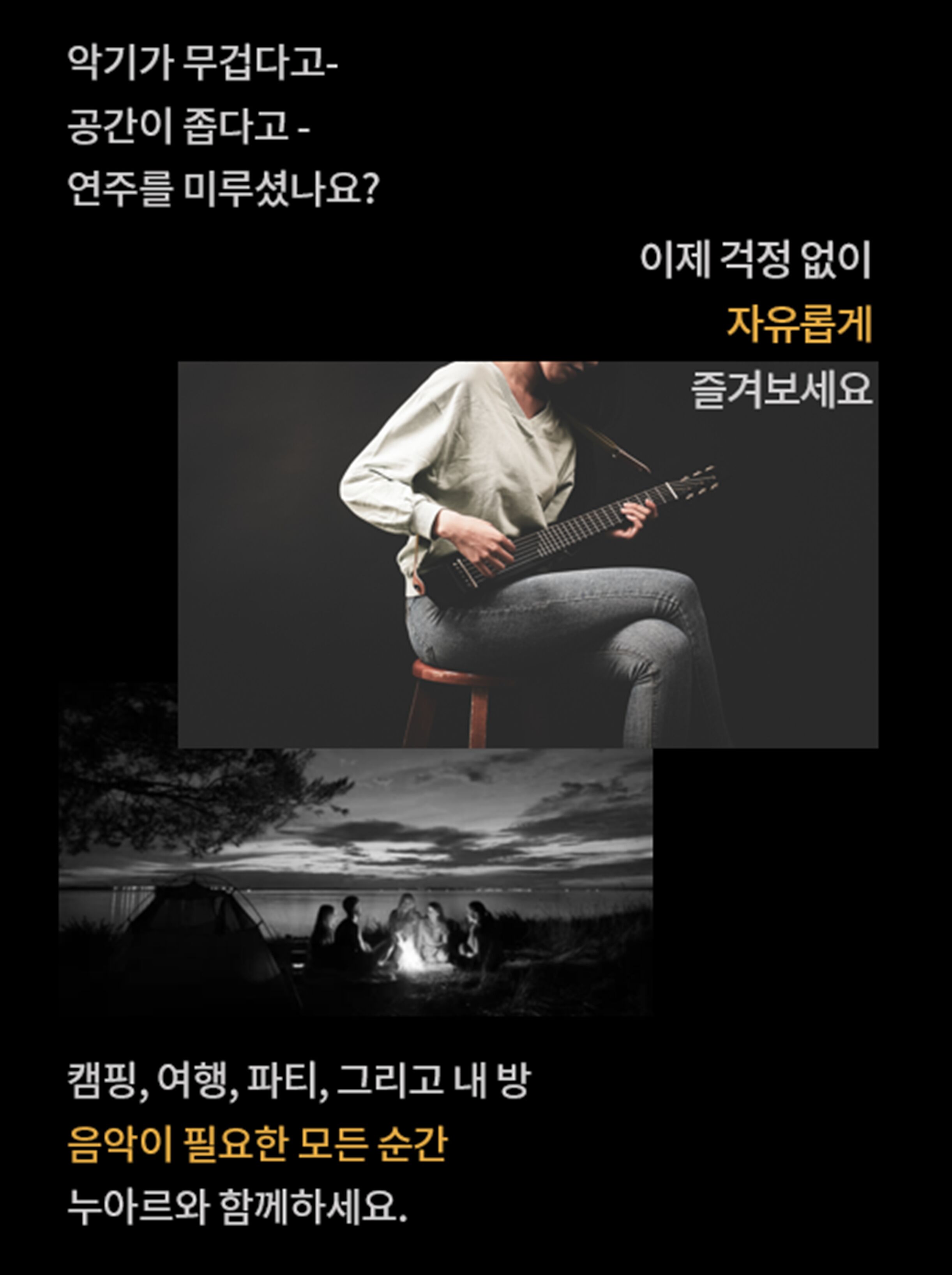 그래도 좀 더 크게 듣고 싶을 때는 헤드폰이나 이어폰을 끼면 됩니다. 혼자 있을 시간이 많을 때, 훌쩍 여행을 떠날 때, 언제 어디서든 작고 가벼운 기타 Noir와 함께하세요.