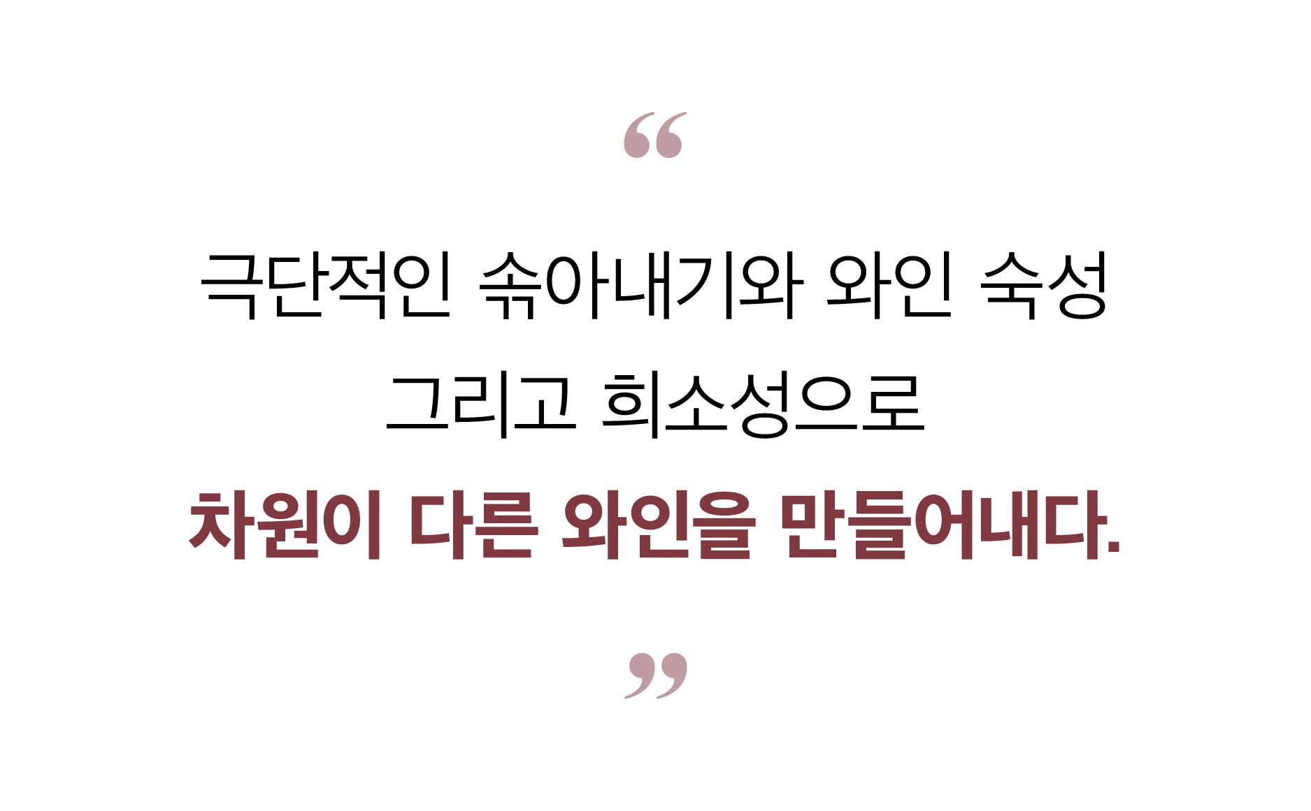 ▷ 10월 첫 주에 Low Bush에서 2가지의 Oak에서 18개월간 발효 + 12개월 병 숙성.
