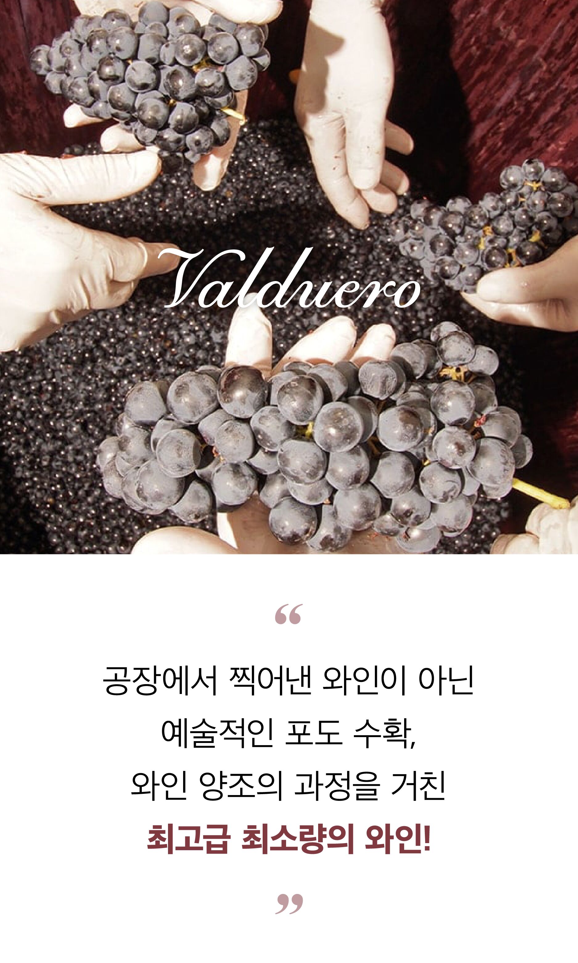 DO 등급 와인 기준 헥타르당 7,000kg 생산이 가능하지만, 발두에로는 최상의 퀄리티 포도에 집중하기 위해 극단적인 솎아내기로 헥타르당 1,000-2,000kg의 포도만을 생산합니다. 더해서 땅과 하늘, 기후에 모든 것을 맡기는 동시에 인간의 개입을 최소화하여 친환경적으로 와인을 재배합니다. 화학적 비료는 전혀 사용하지 않고 자연스럽게 자연과 환경을 그대로 담아내기 위해 노력하고 있습니다.