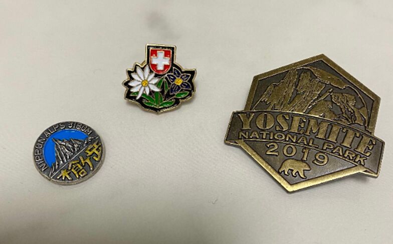 (메이커(저)가 일본, 스위스, 미국의 산을 방문할 때 사온 배지들)