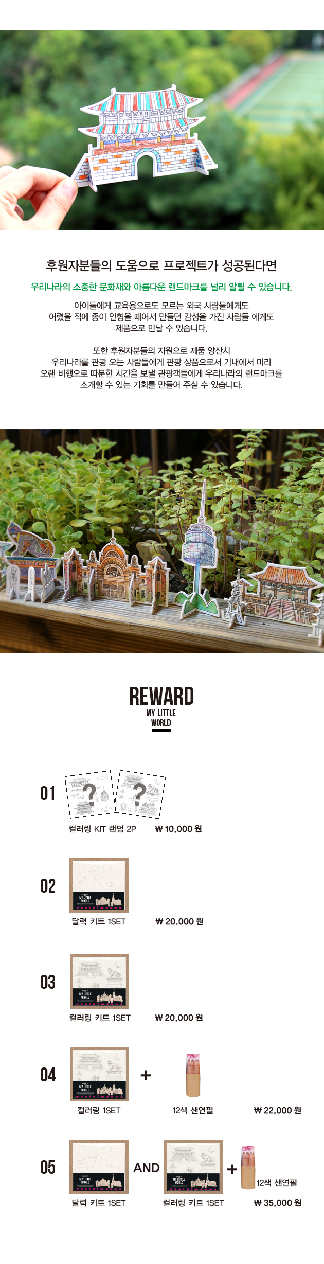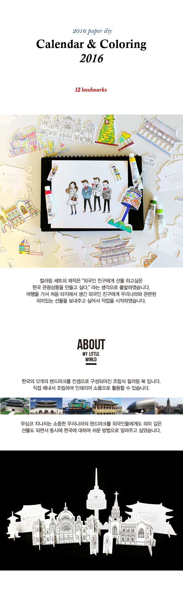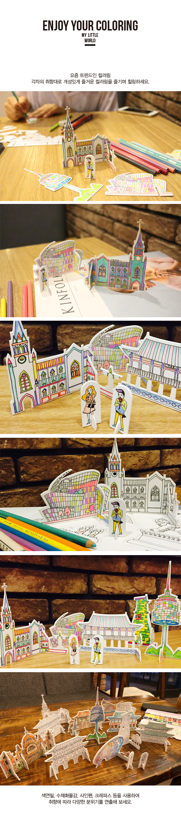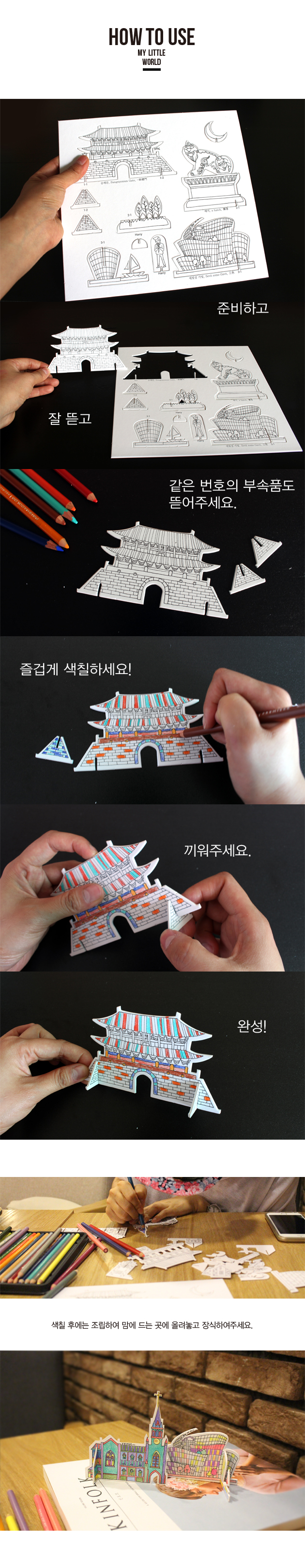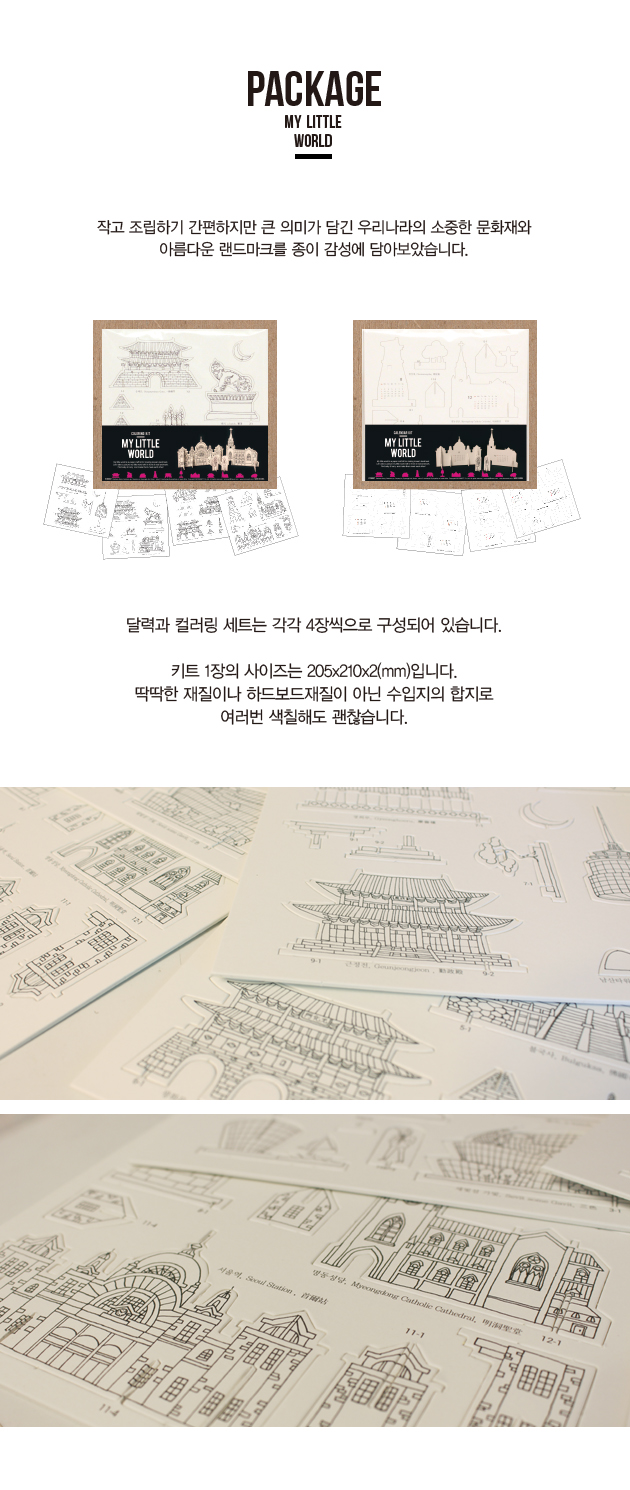 정성들여 색칠한 컬러링북 덮어 버리고 잊게되지 않나요? 이제는 조립해서 어디든 올려놓고 전시하세요. 당신의 컬리링이그대로 작품이 됩니다. 한국의 아름다운 랜드마크로 디자인된 페이퍼토이 입니다.