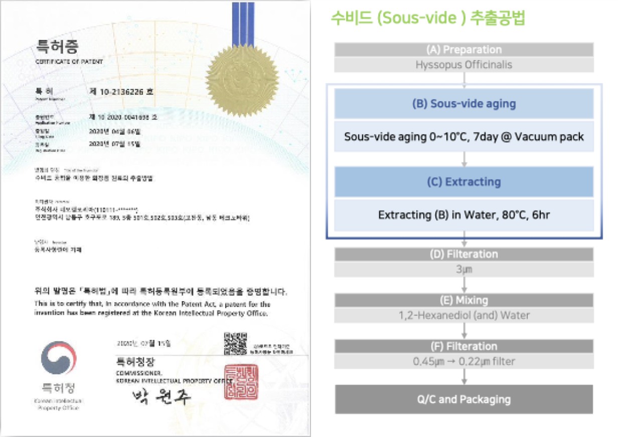 이를 방지하고자 저희는 히솝의 유효성분을 효과적으로 보존할 수 있도록 진공포장 된 히솝의 원물을 0~10°C의 물 속에서 약170시간에 걸쳐 숙성하는 과정을 거칩니다.