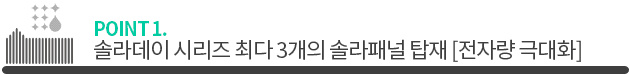 충치의 원인인 뮤타스 균이 플라그를 발생시키지 않게 하고 기존의 플라그는 치아에서 떨어져 다시 치아에 부착하지 않도록 연구 개발된 "솔라데이". 그 핵심 비밀은 “TiO₂ (산화 티탄) 반도체”와 “솔라 패널”에 있습니다. 솔라데이 리듬 2에는 빛을 최대한 이용하여 화학적 플라그 제거에 효과를 발휘하기 위해 시리즈 최다인 3개의 솔라 패널을 장착했습니다.