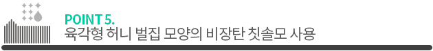 단면이 육각형인 칫솔모는 비장탄(일본 최고의 숯)을 통해 칫솔모 자체에 항균성을 갖게 했습니다. 비장탄 칫솔모는 칫솔 보관시 세균의 번식을 억제 할 뿐만 아니라 육각형의 모서리 칫솔모를 통해 치아의 더러움과 충치균을 제거합니다.