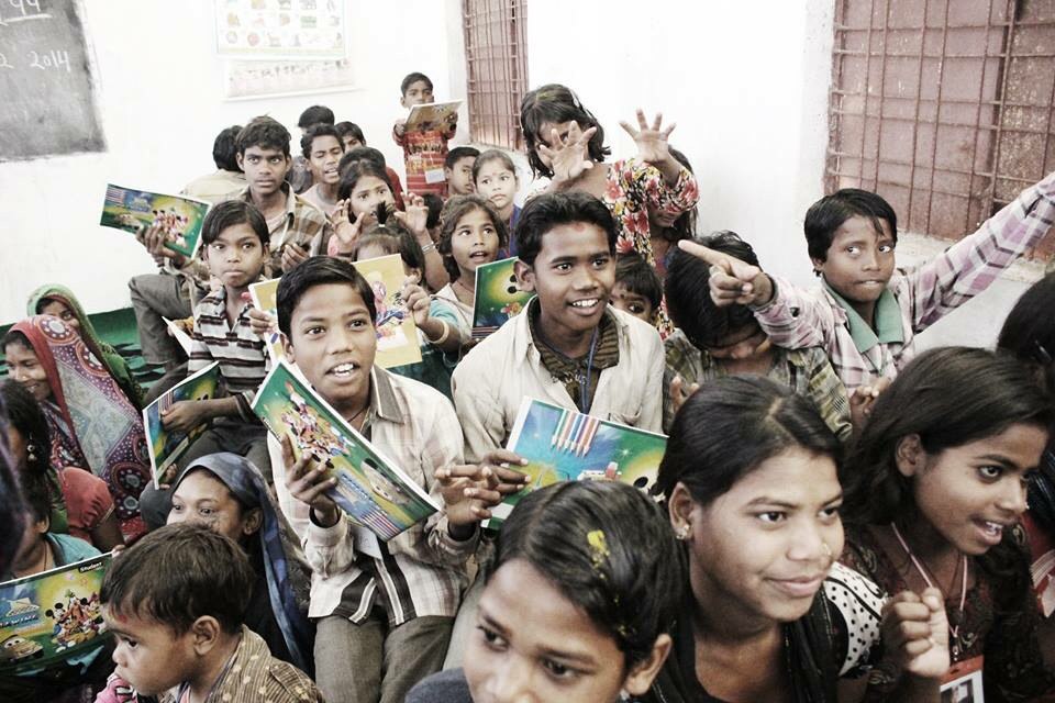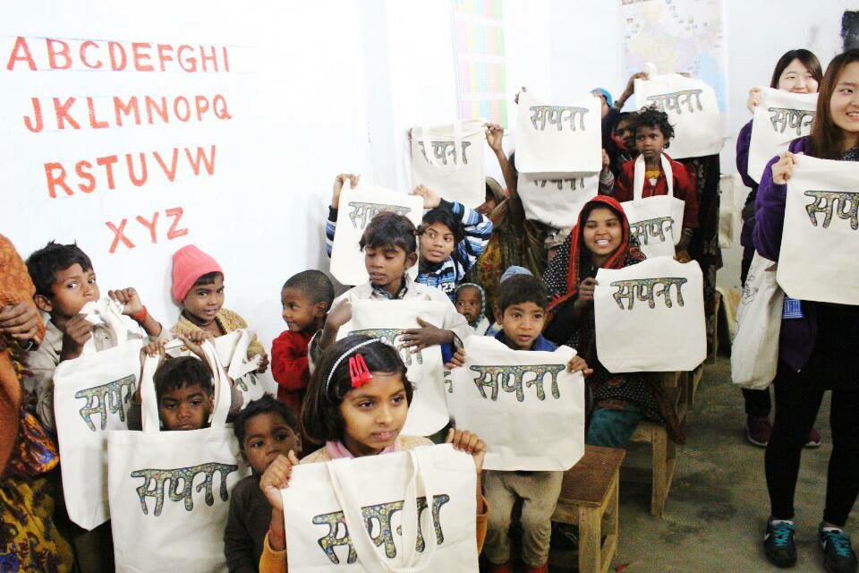 ▲2014년 에코백 모금활동으로 찬드라반 어린이들에게 학용품을 지원한 사진