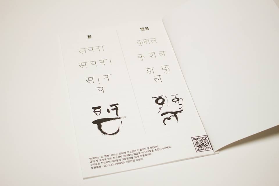 현지 봉사활동을 경험하며 인도 아이들의 교육 환경 개선을 위해 어떤 것을 할 수 있을까 고민하다가 희망을 담는 공책 제작을 결정했습니다. 인도 찬드라반 아이들이 더 이상 글씨도 써지지 않는 갱지로 공책을 사용하지 않기를 바라는 마음을 담아 찬드라반 아이들에게 꿈과 행복을 전해주고 싶다는 소망의 꿈, 희망이 깃들어 있습니다.