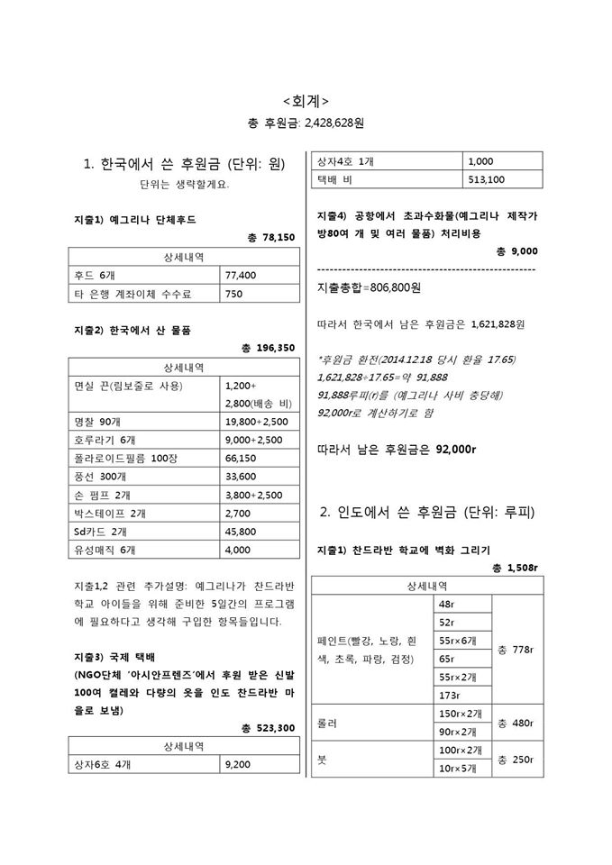 2014년 에코백 모금활동 후 첨부한 회계정보입니다. 2015년에도 모금 활동에 대해 투명하게 공개할 것을 약속드립니다.