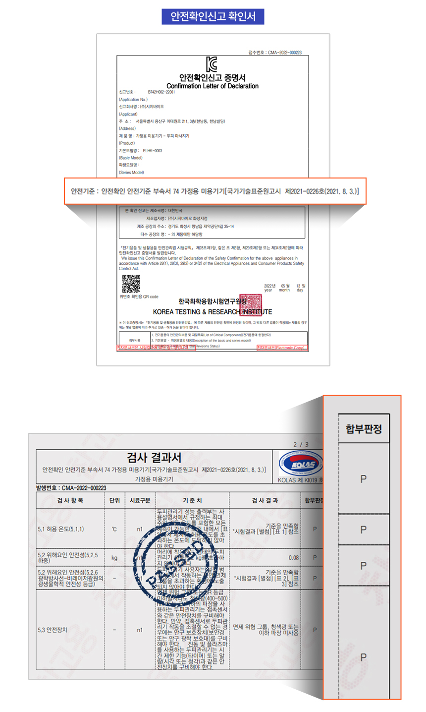 이지엘 헤어 두피관리기는 한국화학융합시험연구원에서 실시한 안전 관리법에 따른 안전확인 테스트 모두 적합 판정을 받았습니다! 효과는 물론 온도 / 위해요인 / 안전장치에 관련하여 안전성이 증명되었습니다!