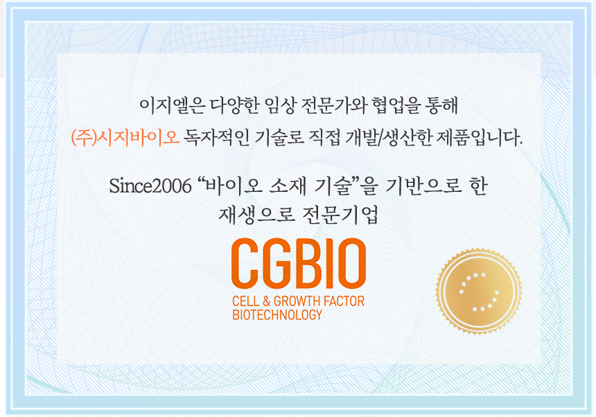 시지바이오는 바이오 소재 기술은 기반으로한 재생전문 기업입니다. 이지엘은 그냥 탄생 하지 않았죠. 다양한 임상 전문가와 협업을 통해서 시지바이오의 독자적인 기술력으로 직접 개발 생산한 제품입니다.