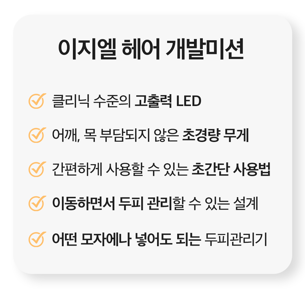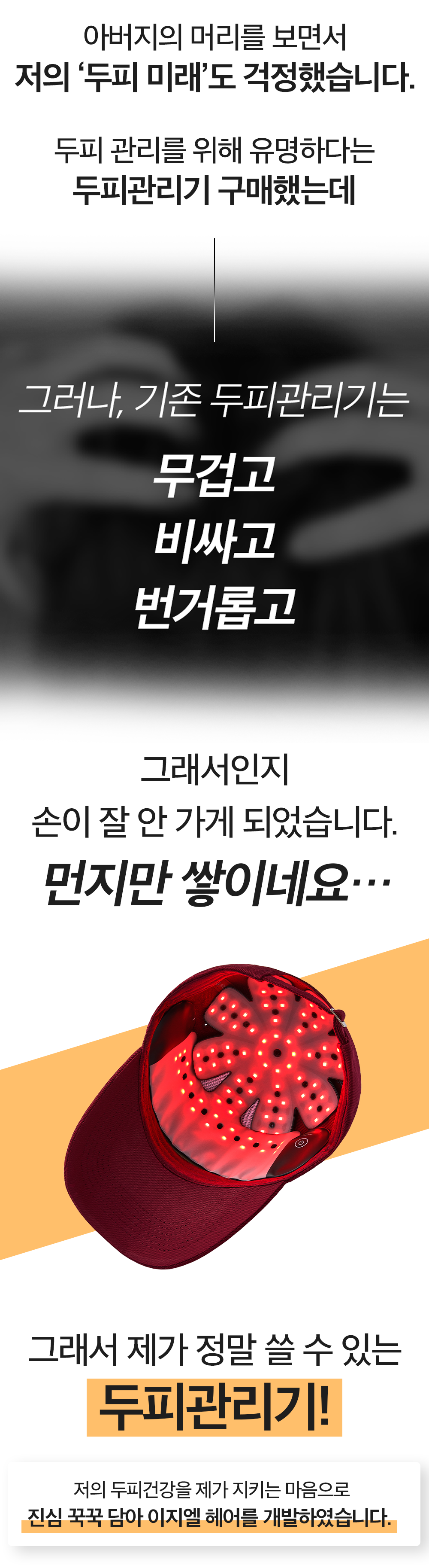예약구매로 새로운 일상을 발견하고, 새로운 쇼핑을 할 수 있는 와디즈에서 2040 두피 고민이 많은 분들에게 76g 가벼운 무게와 고출력 LED, 나만의 스타일을 살릴 수 있는 이지엘 헤어로 MZ 세대들의 두피 고민에 공감하며, 해결해 주고, 더 나은 삶의 희망이 될 수 있게 도와줄 수 있는 채널 와디즈를 선택하게 되었습니다.