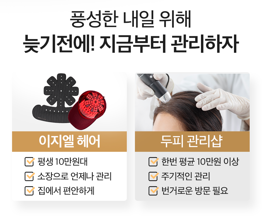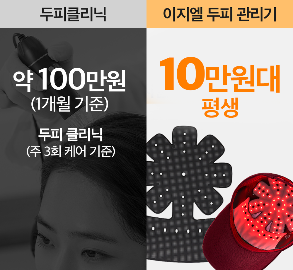 이지엘헤어는 고가의 두피관리기가 부담스러워 사용하지 못했던 모든 사람들을 위해 만들어졌습니다. 단 10만원대로 고가의 두피클리닉만큼의 효과를 누려보세요.