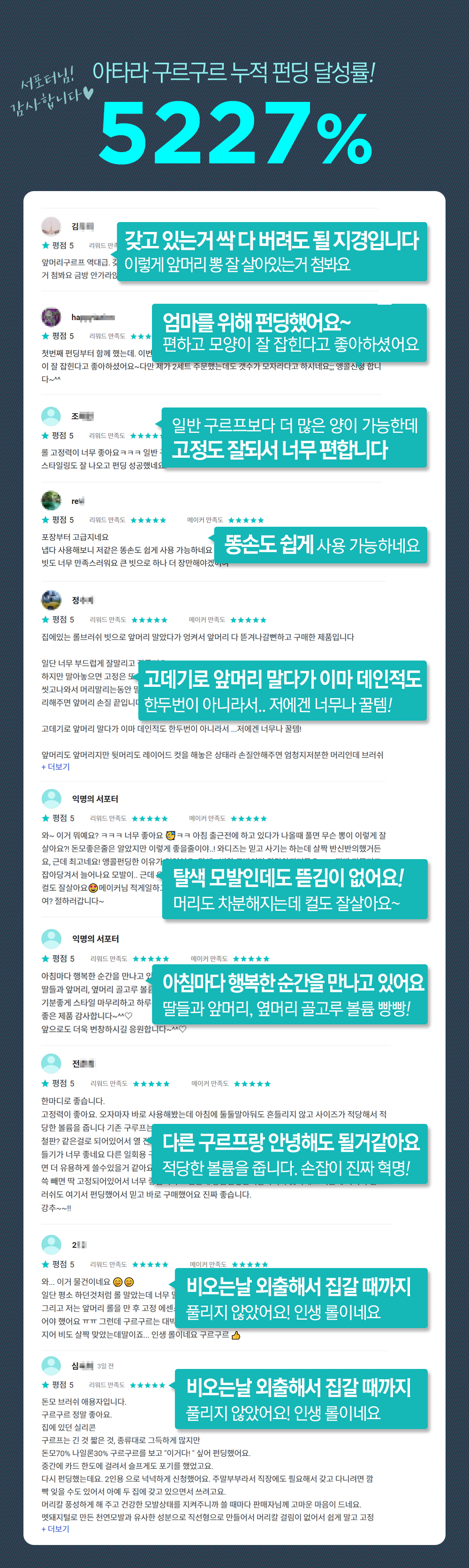 많은 고객님들의 니즈에 맞춰, 오직 앞머리 롤링을 위해 연구 개발을 하였습니다. 대충 쓰다가 또 바꾸는 구르프가 아닌, 앞머리 전용이지만 오랜 시간 쓸 수 있는 '프리미엄 구르프'를 만들고 싶었습니다. 아타라만의 기술력과 고급 돈모로 만들어진 구르구르를 지금 만나보세요.