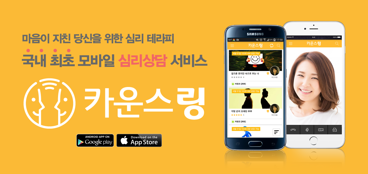 (주)카운스링은 야후, 삼성전자 출신 조성식 대표와 정신과 전문의 박여진 이사가 지난해 5월 창립한 스타트업으로 약 1년 간의 준비 기간을 거쳐 지난 4월 6일 안드로이드 버전을 출시하였으며 런칭 6개월만에 약 2만명의 실제 내담 회원을 확보하며 급성장 중인 국내 최초의 모바일 심리상담 서비스입니다.