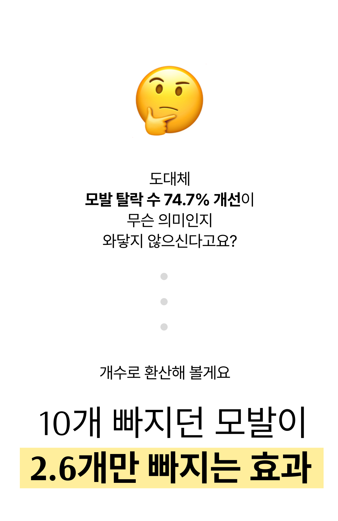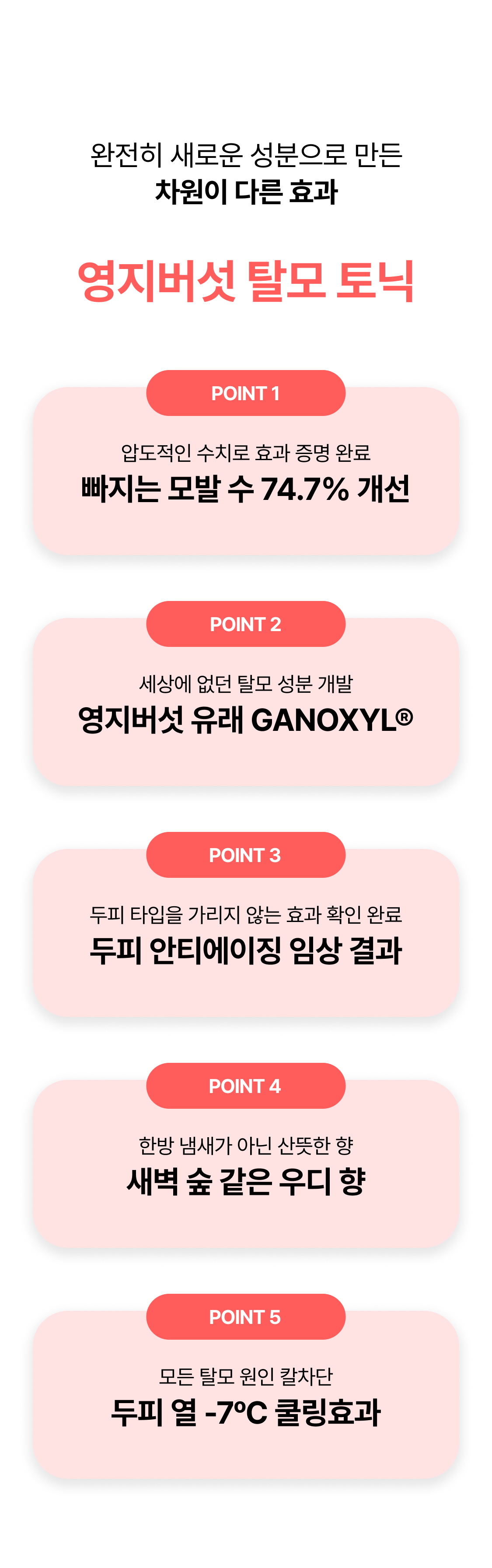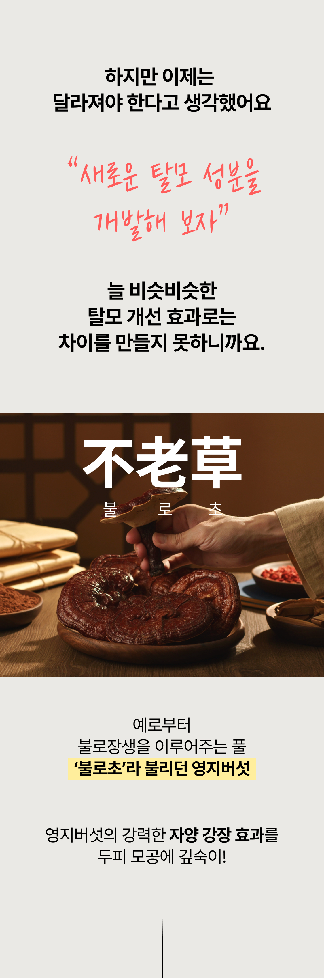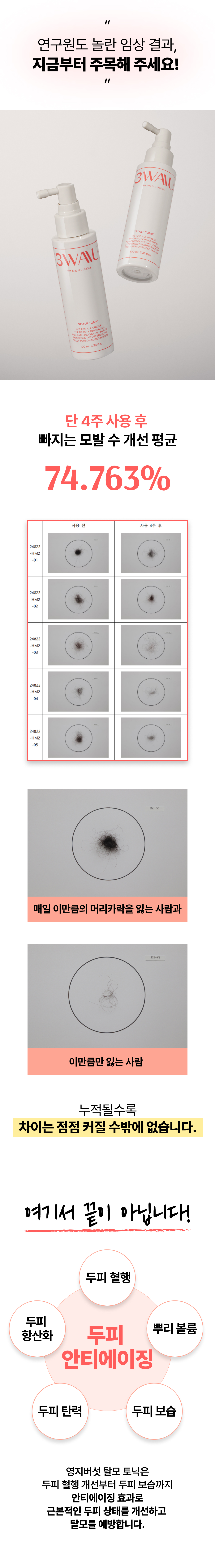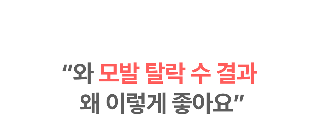 3년의 연구 끝에 개발! 연구원도 놀란 압도적 모발빠짐 개선 수치 74.7% 전에 없던 '영지버섯' 활용 탈모 특허 성분으로 빽빽해지는 두피를 마음껏 누려보세요.