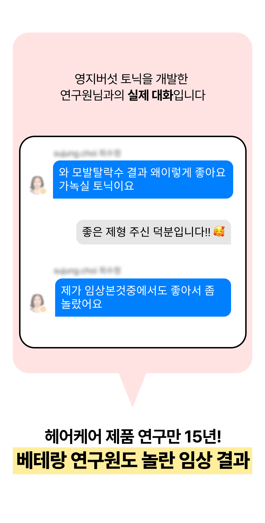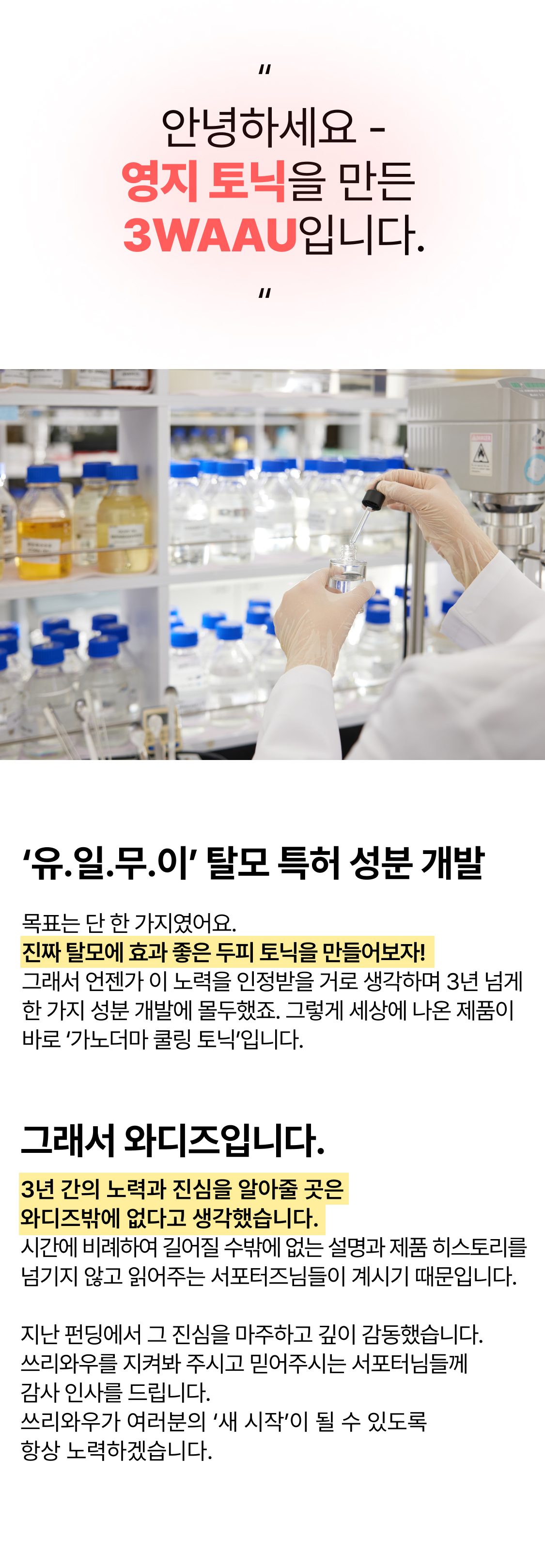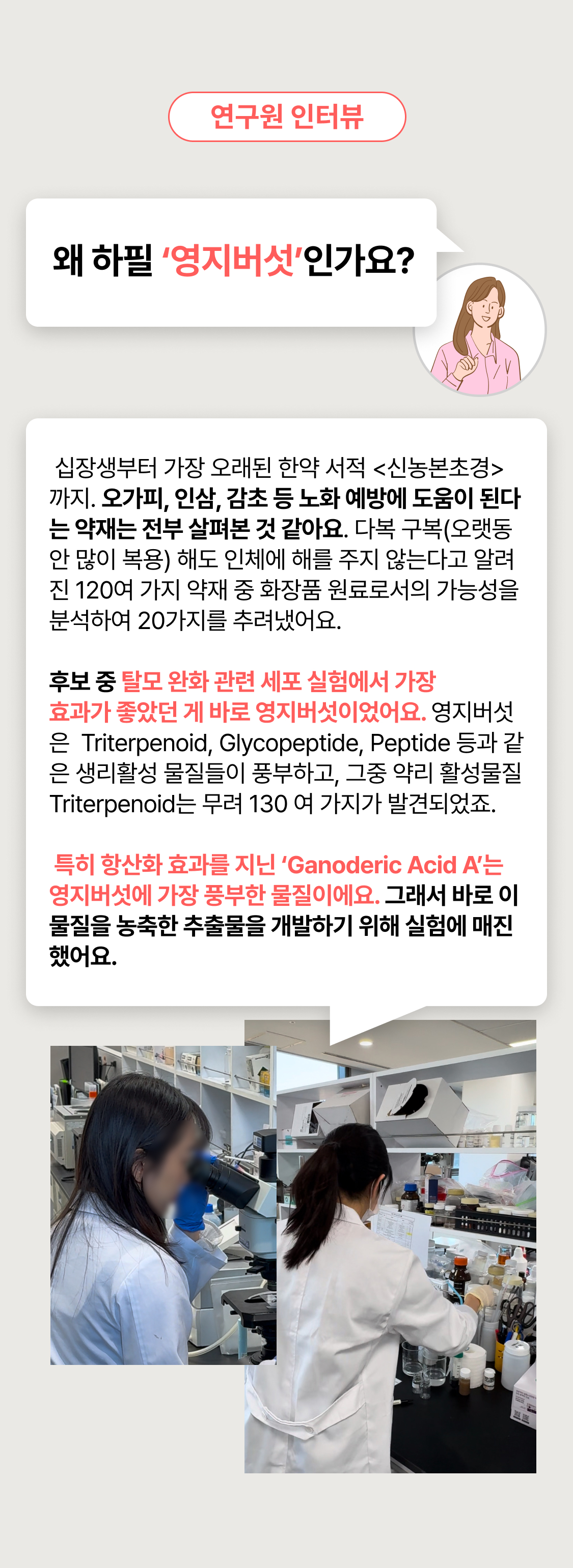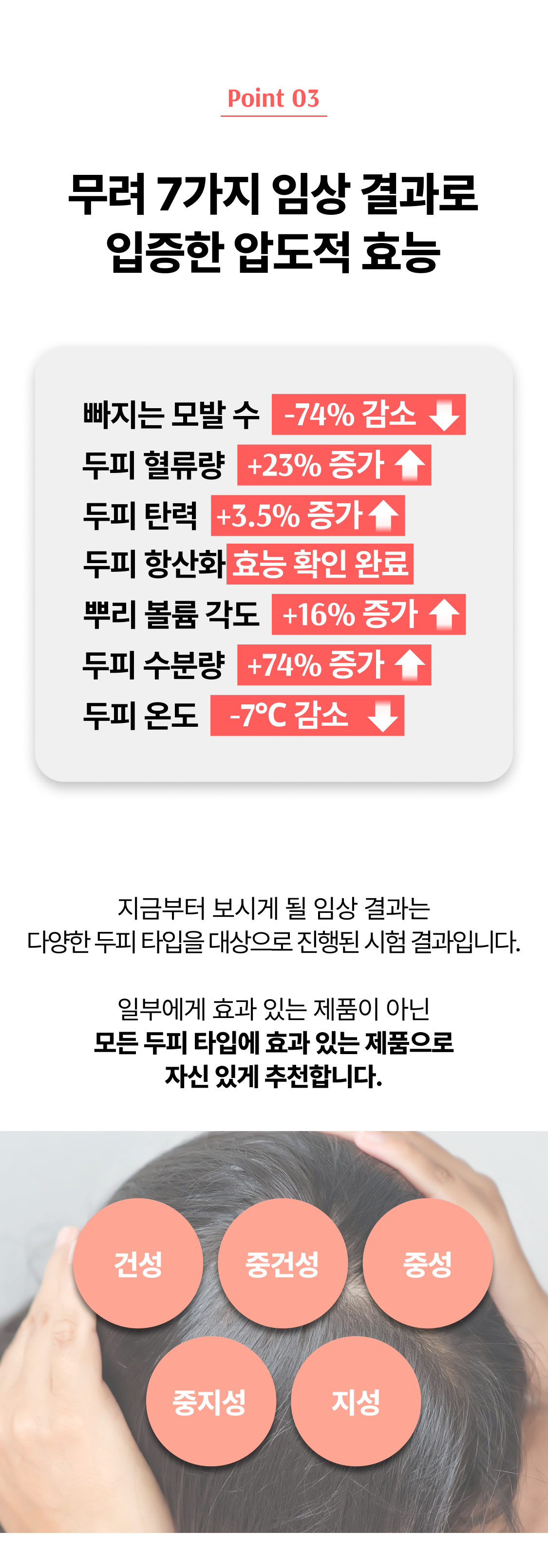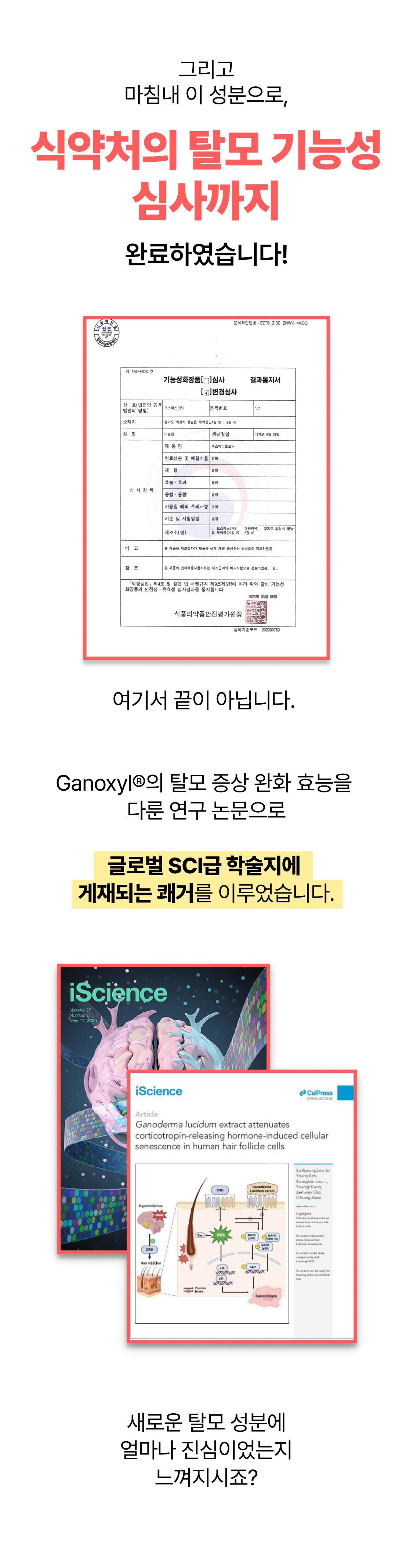 3년의 연구 끝에 개발! 연구원도 놀란 압도적 모발빠짐 개선 수치 74.7% 전에 없던 '영지버섯' 활용 탈모 특허 성분으로 빽빽해지는 두피를 마음껏 누려보세요.