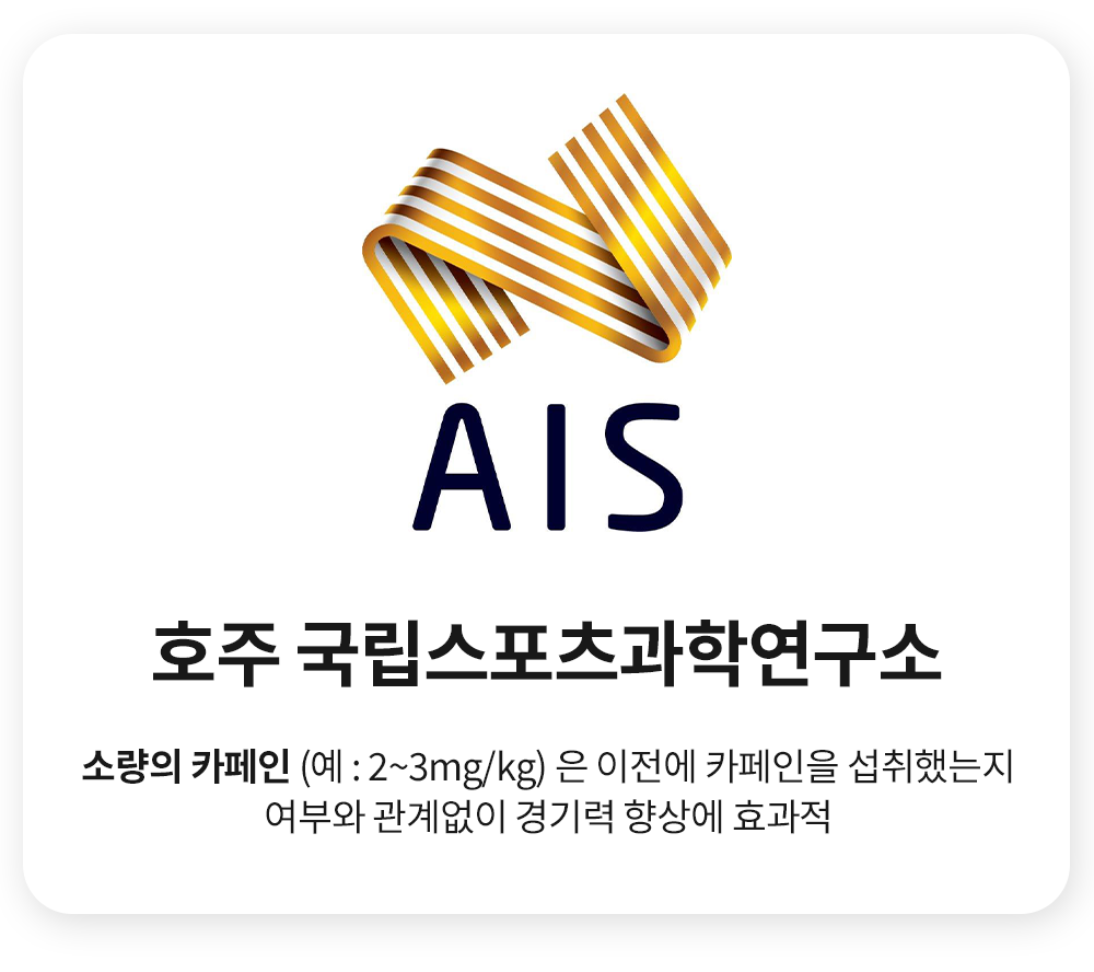 호주 국립스포츠과학연구소(AIS) 에 따르면, 카페인은 소량의 카페인 (2~3mg/kg) 은 이전에 카페인을 섭취했는지 여부와 관계없이 경기력 향상에 효과적입니다.