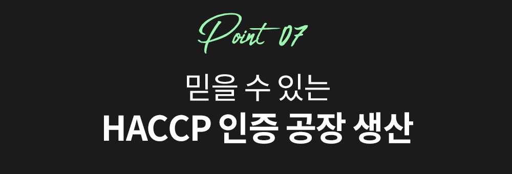 식품안전관리인증기준 (HACCP) 인증을 받은 믿을 수 있는 제조사에서 제조한 제품입니다. HACCP 인증 공장에서 100% 국내생산으로 진행됩니다. 원료 하나 하나 모두 엄선하였으며, 안전한 인증 공장에서 엄격한 관리를 통해 생산되어, 믿고 드셔도 좋습니다.