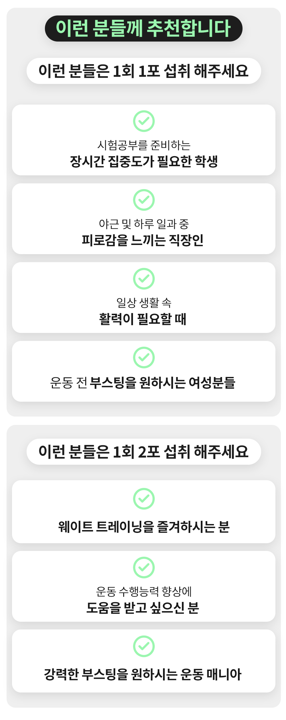 카페인 섭취의 안전사항을 고려 (1일 400mg 이하, 언제든지 200mg 이하) 및 경기력 향상에 효과적인 200mg를 설계했습니다.