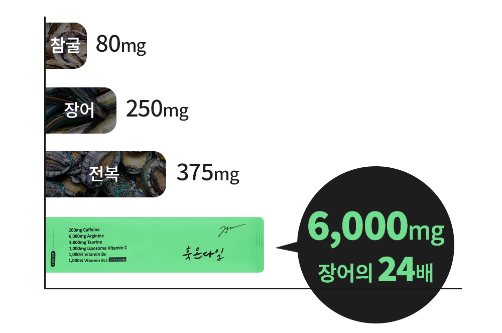 훅온다일에 첨가된 타우린 3,000mg 는 활력의 대명사로 불리는 낙지 351g, 갑오징어 379g, 문어 689g 에 포함된 타우린 함량입니다.