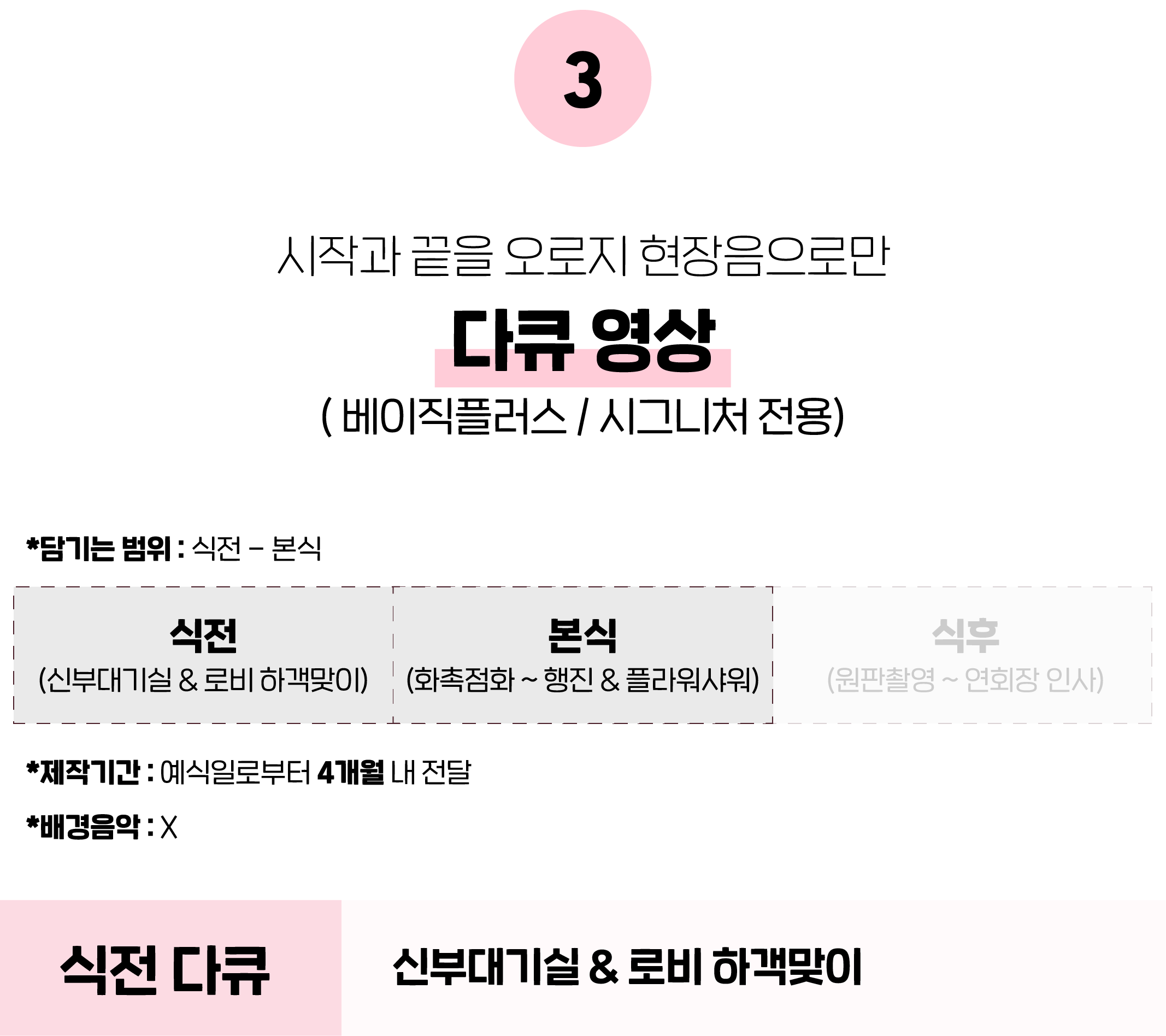 사진 촬영이 3시간 이상이실 경우, 영상촬영 시작시간을 정하실 수 있습니다.