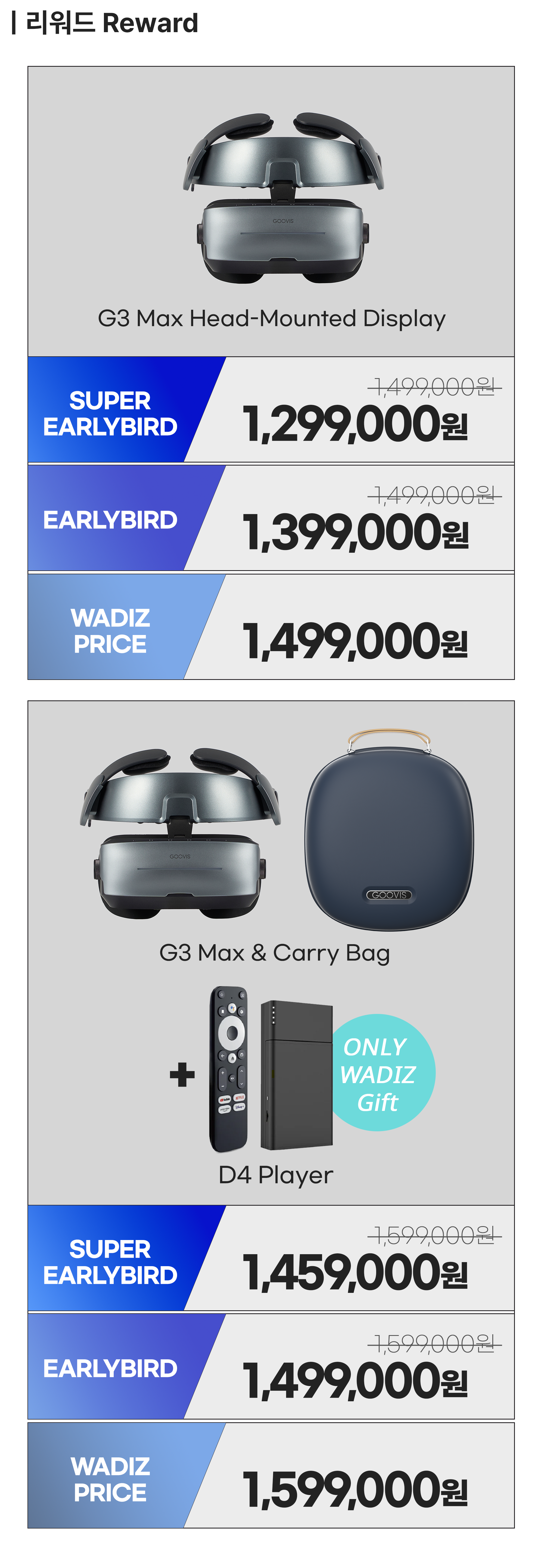서포터님들의 소중한 펀딩금은 GOOVIS VR 기기 제품들을 한국에 공식 런칭하는데 사용될 예정이며 와디즈에는 같은 상품임에도 더 새로운 기능을 넣은 서포터님들이 많이 계신 곳이라 생각되어 와디즈에서 첫 런칭을 하게되었습니다.