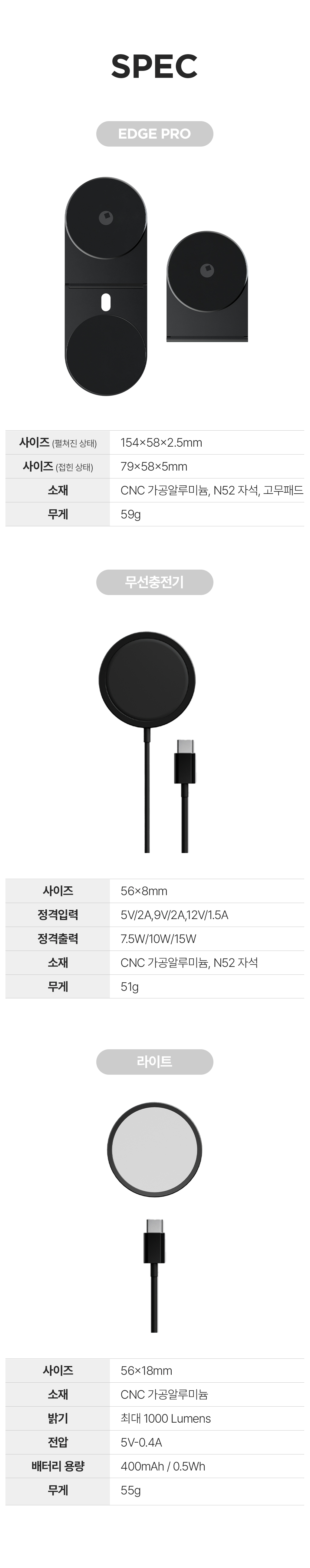 EDGE Pro 무선 충전기는 MagSafe 기술을 채용하고 있지만 MagSafe와 비-MagSafe 기기 모두와 호환되며 최대 15W의 충전을 제공합니다. CNC 가공 알루미늄으로 만들어졌으며 강력한 N52 자석이 장착되어 있습니다.