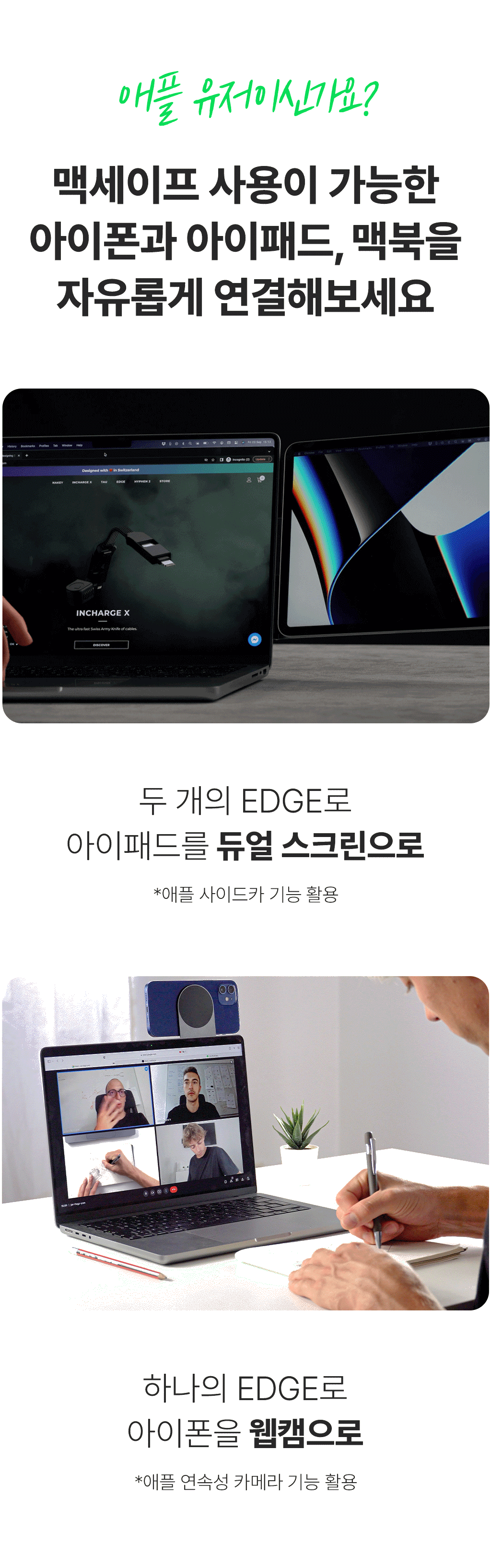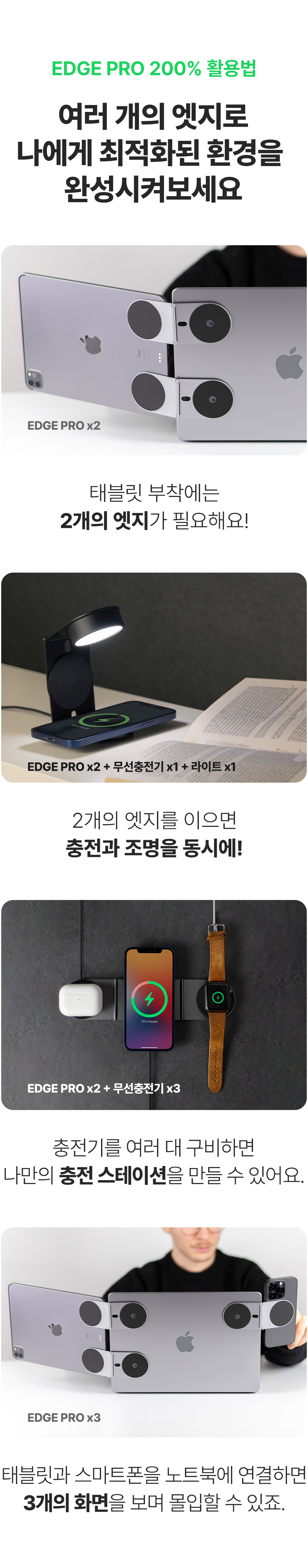 네 가능합니다. 기본적으로 안드로이드 기기와 태블릿은 MagSafe 호환 기능이 없지만, 저희는 패키지에 접착식 메탈 디스크, 메탈 링을 포함하여 이 문제를 해결할 수 있도록 했습니다. 사용자는 태블릿의 뒷면에 두 개의 접착식 메탈 디스크를 붙이기만 하면 됩니다. 이것은 아이패드든 안드로이드 기기든 상관없이 가능합니다. 스마트폰의 경우 접착식 금속 링을 사용해 주세요. 이렇게 하면 노트북 옆이나 독립적으로 사용할 수 있는 MagSafe 호환 기기로 모든 기기를 변환할 수 있습니다.태블릿을 연결하려면 두 개의 EDGE Pro 코어, 두 개의 접착식 메탈 링 및 두 개의 접착식 메탈 플레이트가 필요합니다.