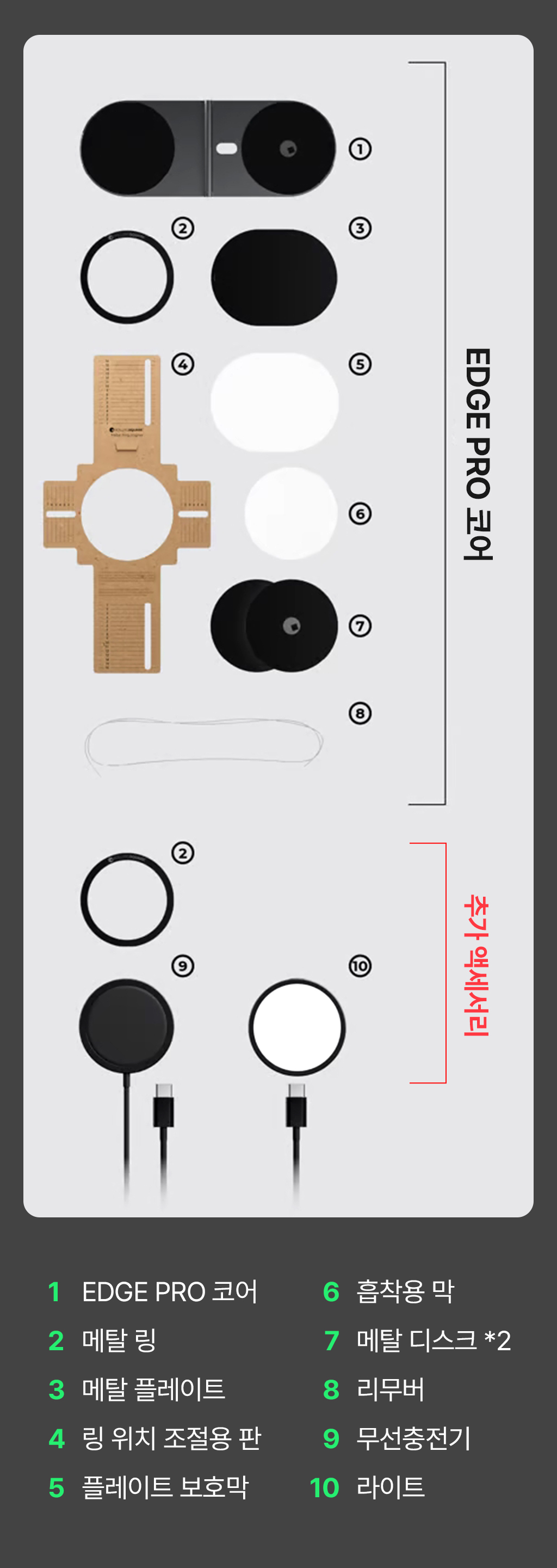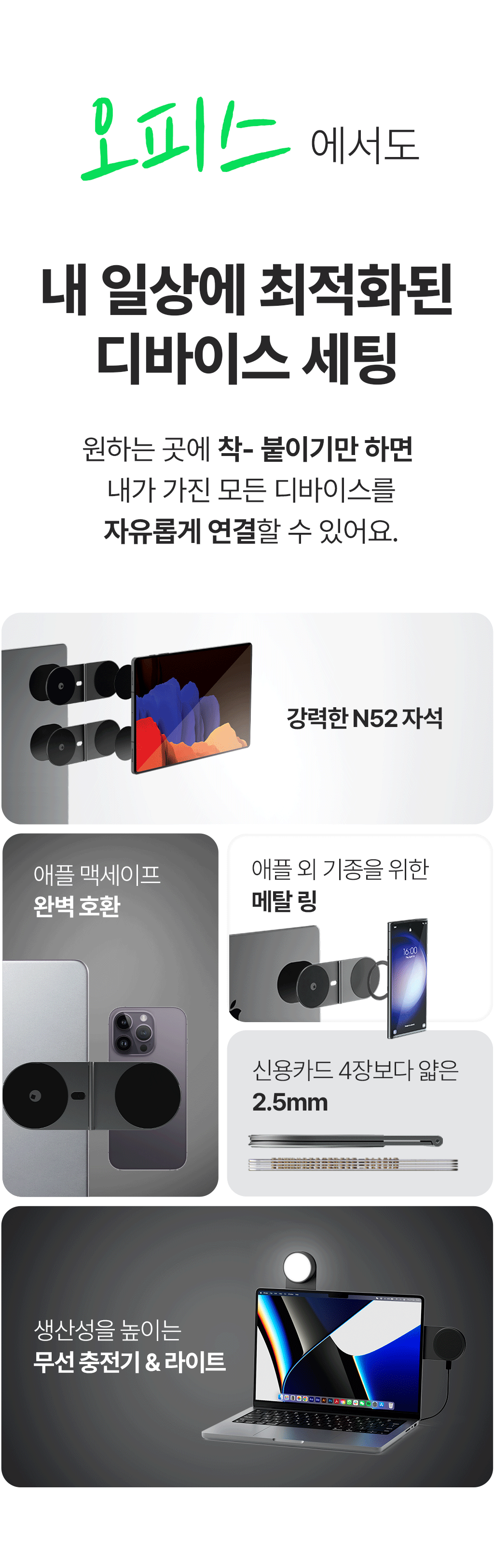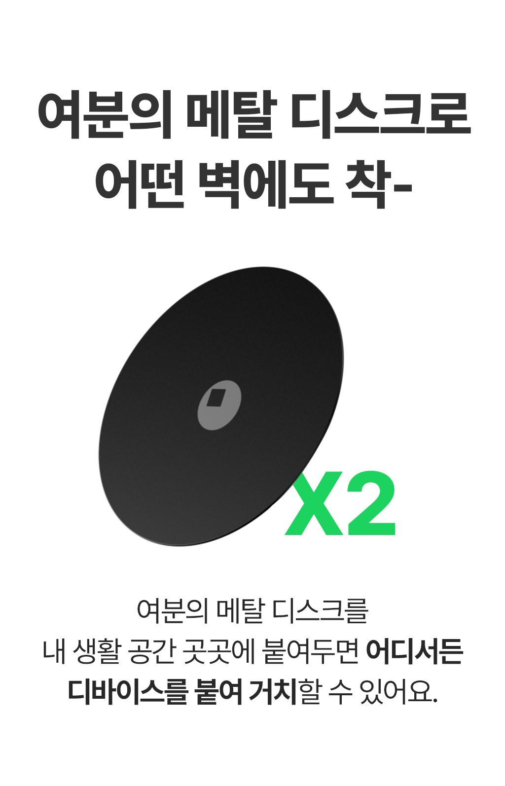 이 키트는 iPhone 12 이상, iPhone 8 이상, 무선 충전을 지원하는 모든 안드로이드 기기 및 태블릿을 포함한 MagSafe 기기와 호환됩니다. 비-MagSafe 기기를 위한 메탈 링 및 디스크가 함께 제공됩니다.