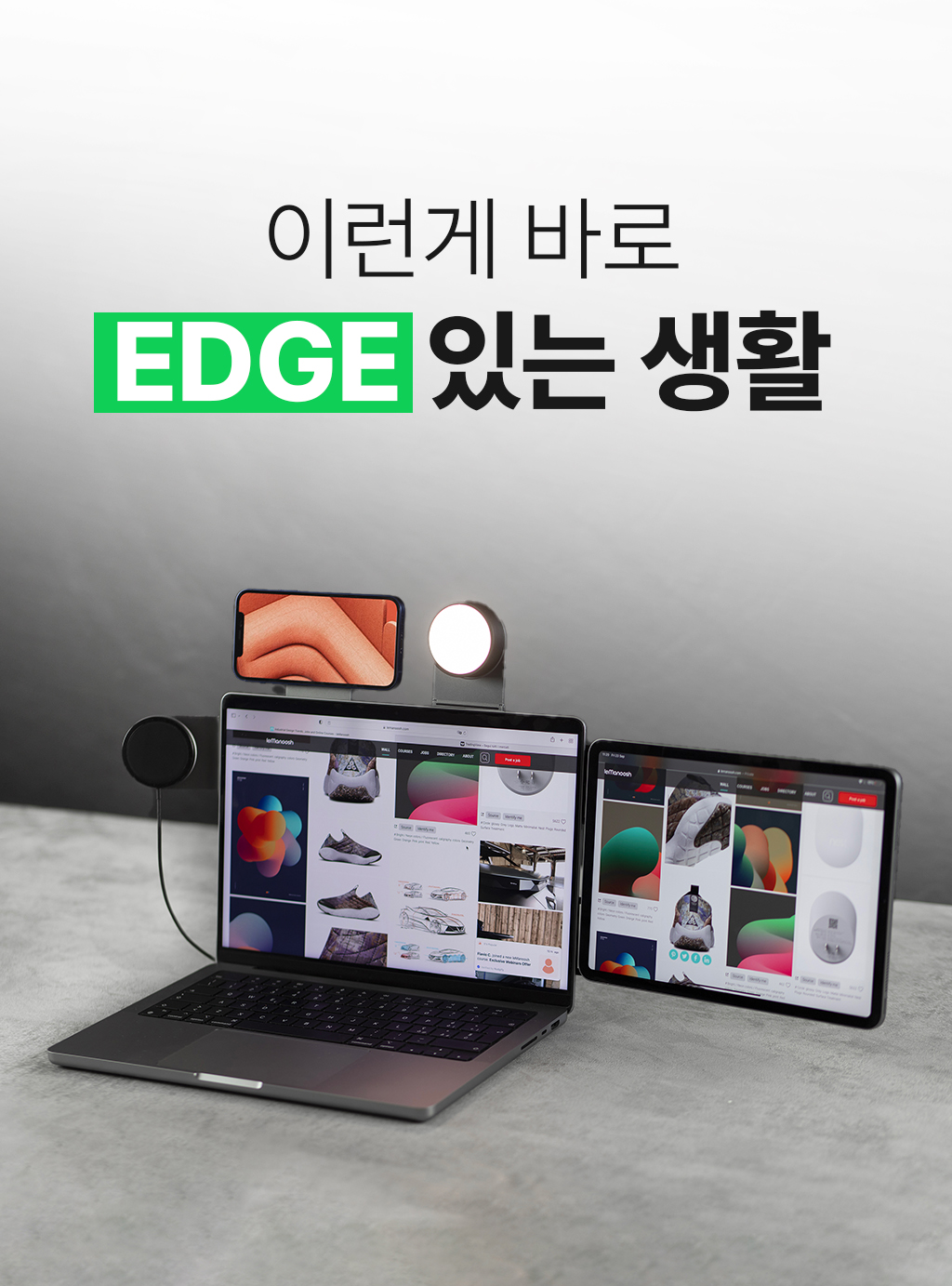 EDGE Pro 코어는 어떤 폰이나 태블릿이든 자석으로 보관할 수 있는 범용 마운트입니다. 노트북에서 분리하여 독립적으로 사용할 수 있으며 EDGE Pro 무선 충전기와 EDGE Pro 라이트에 부착할 수 있습니다.