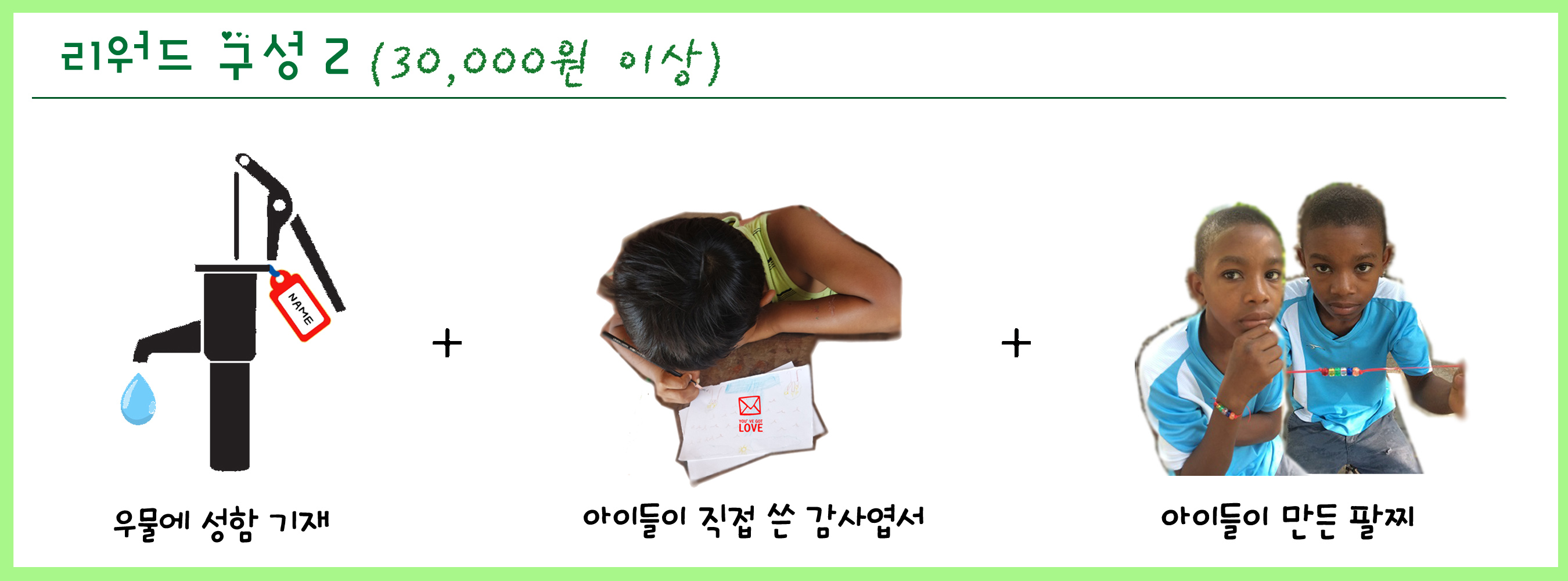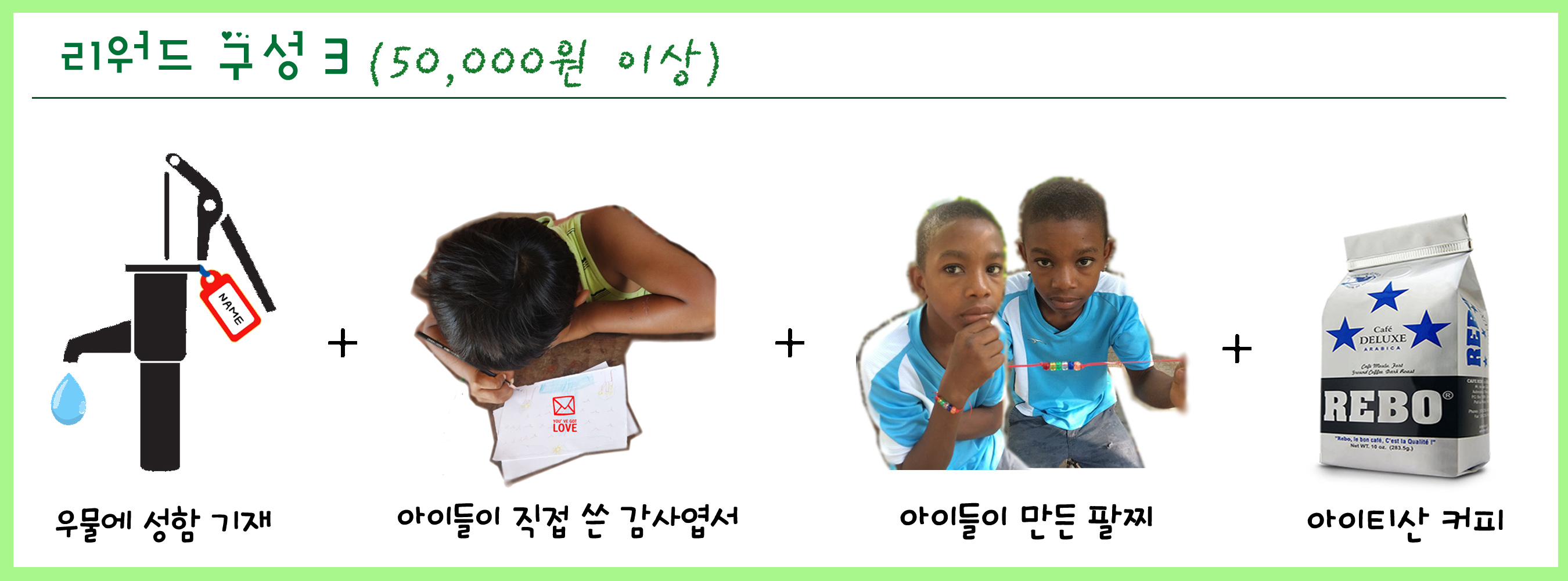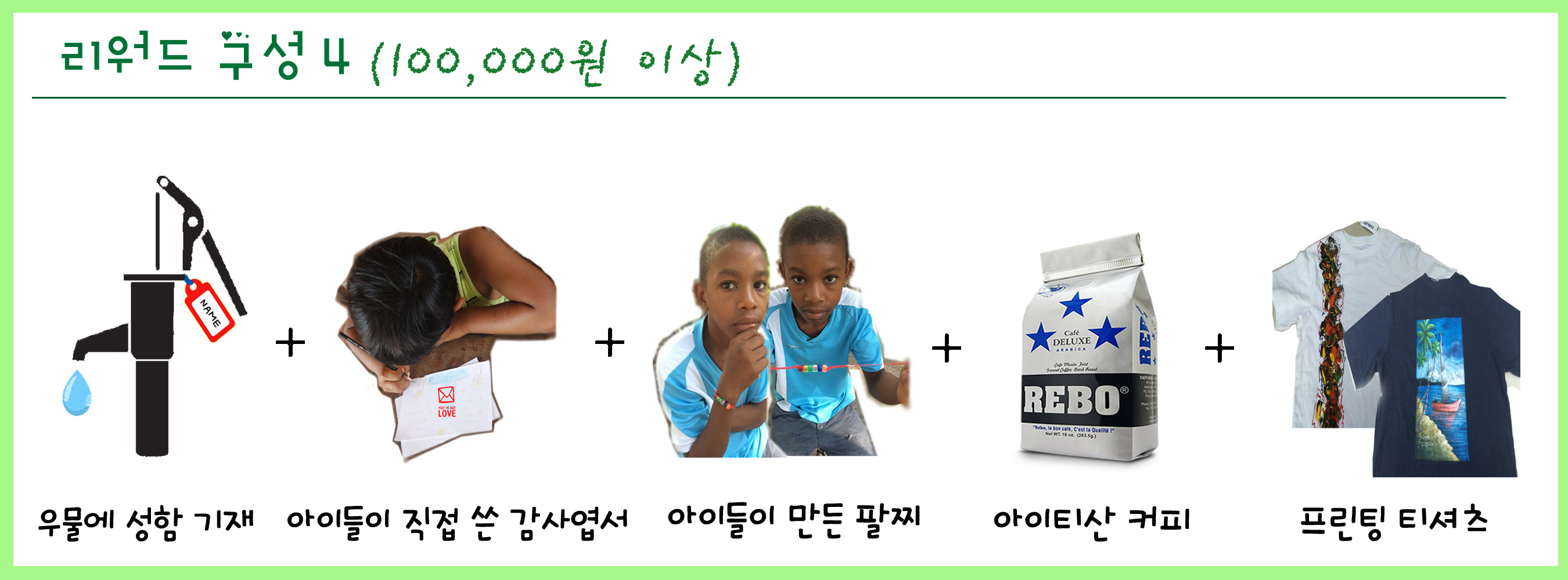 리워드 구성 1번 + 아이티 아이들이 직접만든 팔찌(팔찌는 다양한 색상으로 구성된 6가지 큐빅으로 완성되며 후원자 1명당 2개의 팔찌를 제작, 하나는 현지 아이에게 다른 하나는 후원자에게 전달)