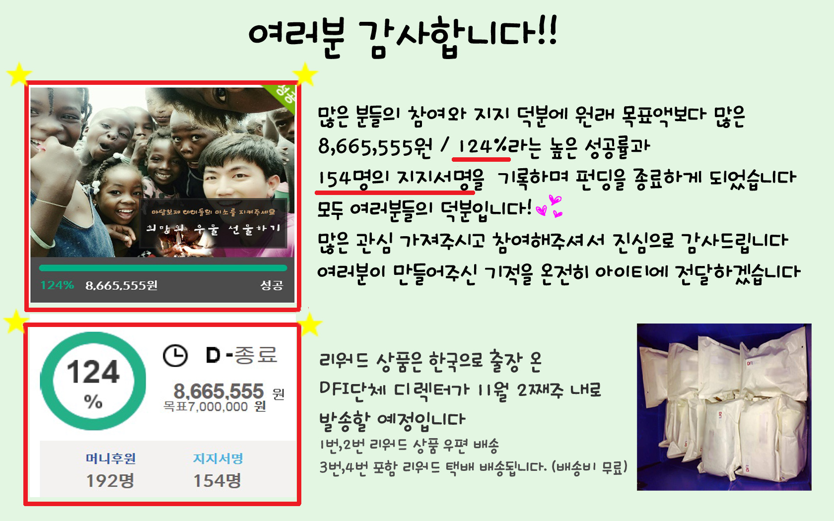 - 그 외 리워드 상품은 11월 중 한국으로 출장을 가는 DFI단체 디렉터가 여러분들께 감사의 마음으로 전달할 예정입니다.