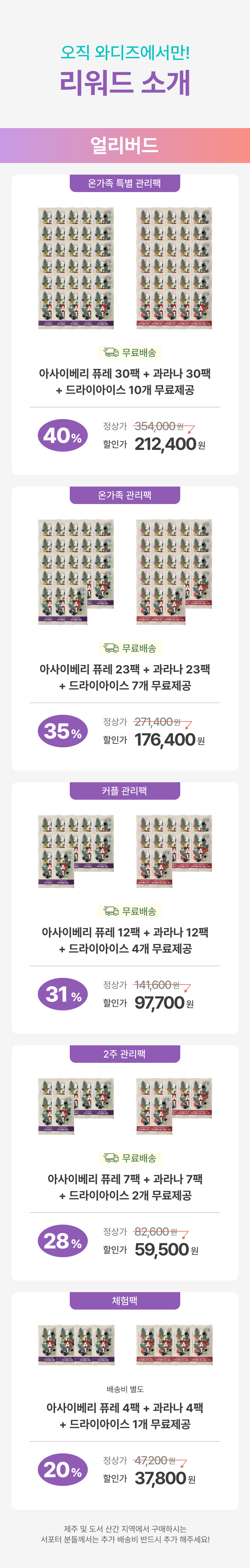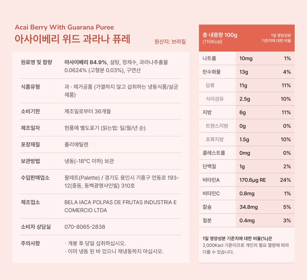 - 포장 방법 : 팔레트의 아사이베리 퓨레 제품은 리워드별 최적화된 포장방식(아이스박스 규격, 냉매제 (드라이아이스)) 사용으로 파손 위험이 없이 안전하게 박스 포장 후 출고합니다.