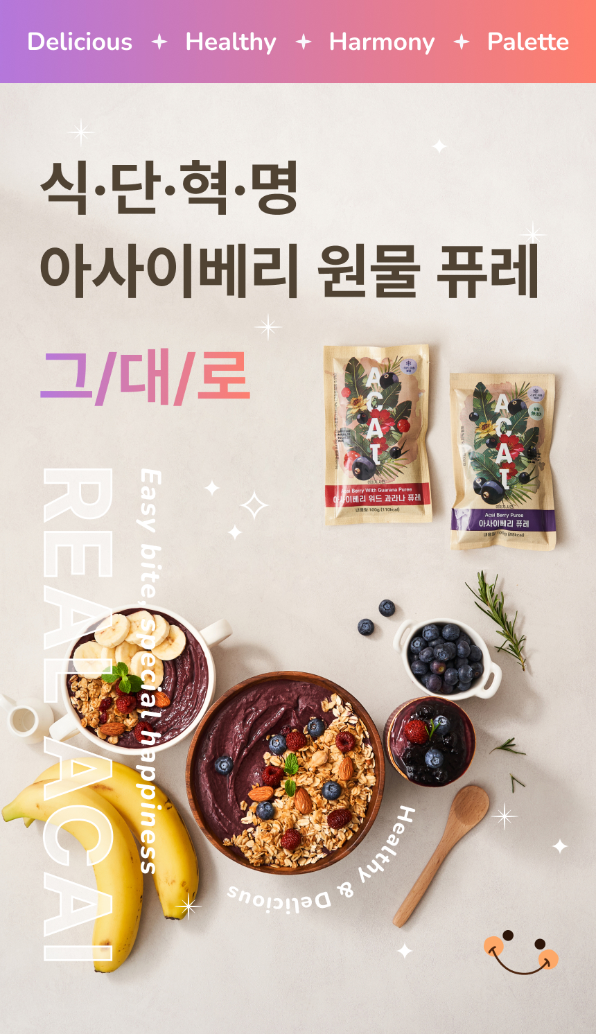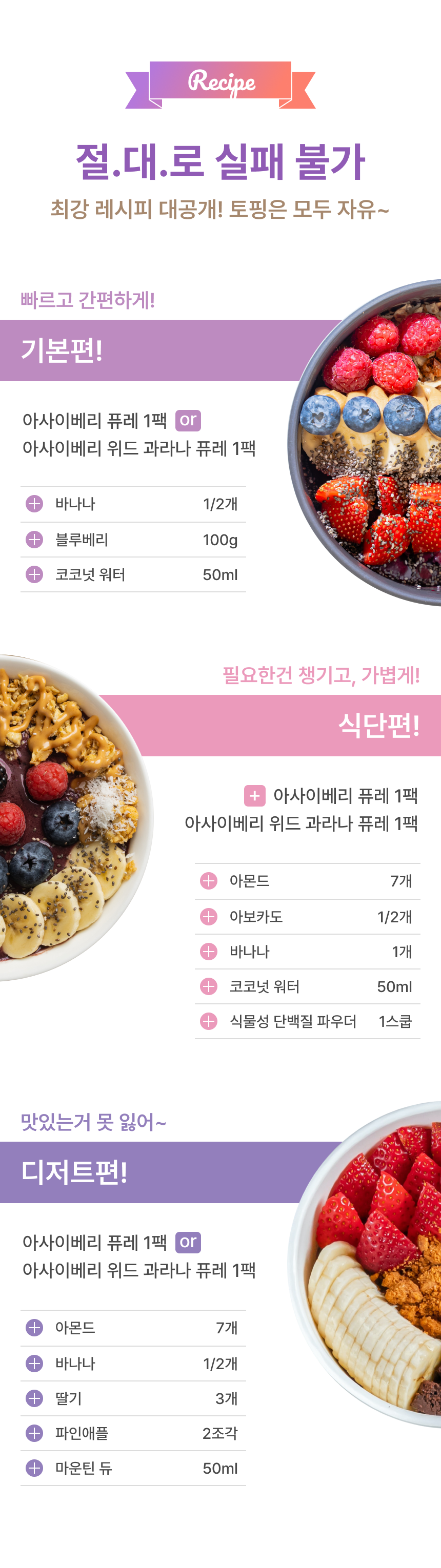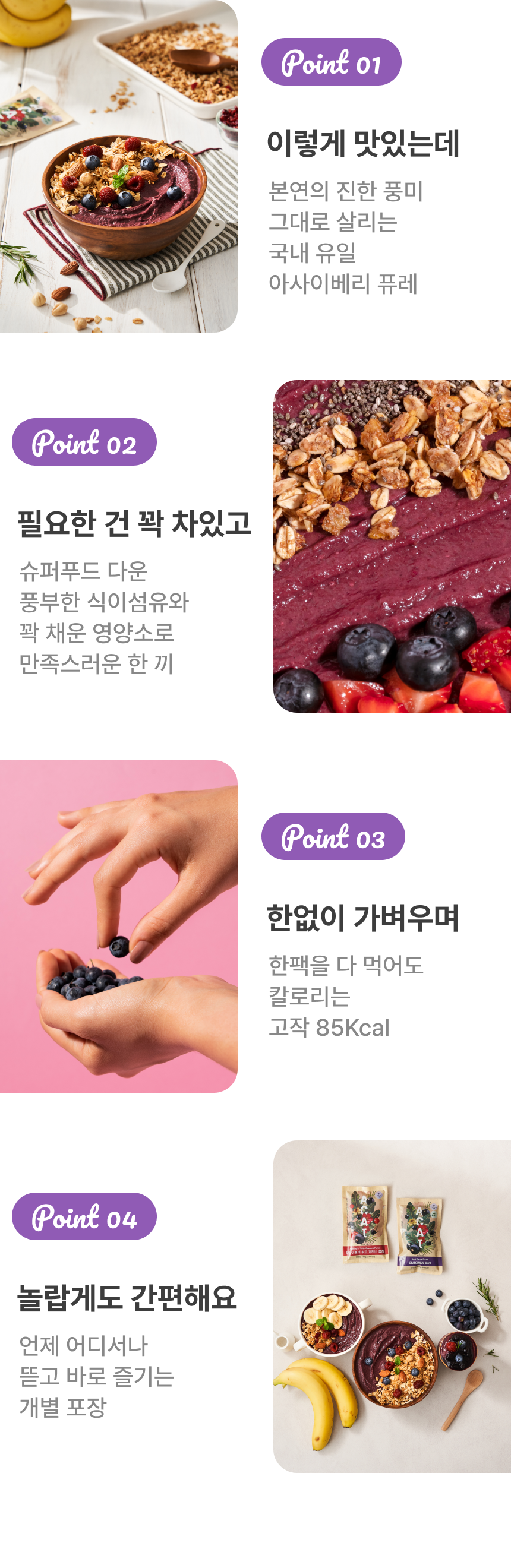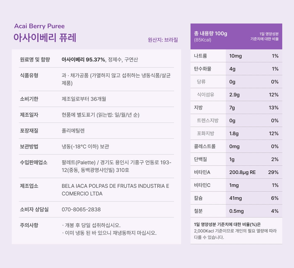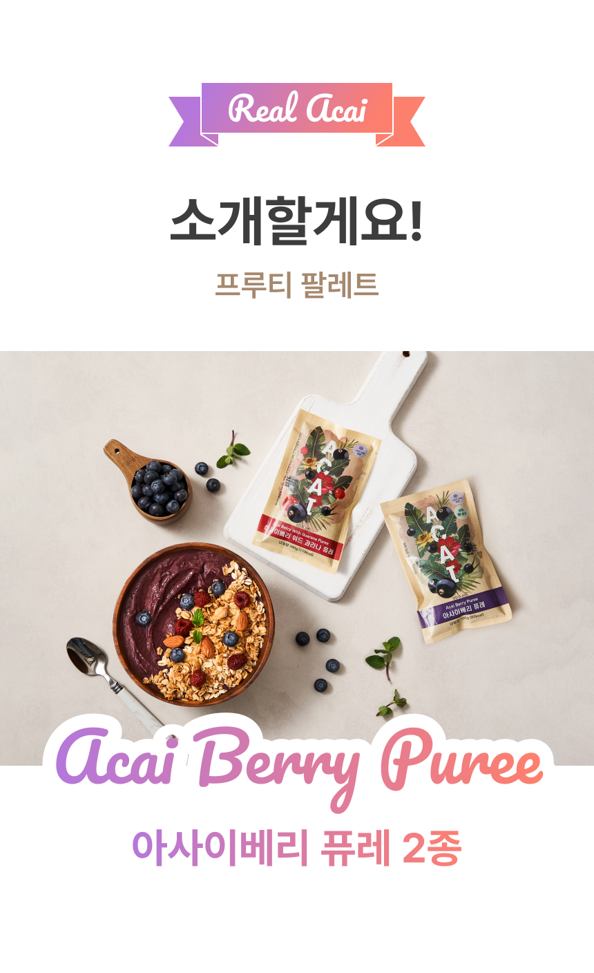 아사이베리 퓨레 2종은 수입원 팔레트에서 처음으로 소개하는 제품으로, 슈퍼푸드 아사이베리를 파우더가 아닌 냉동 퓨레로 풍미 있게 즐길 수 있다는 점이 매우 매력적인 제품입니다. 그래서 차별화된 가치를 알아보시는 와디즈 서포터님들께 꼭 소개해드리고 싶었습니다.