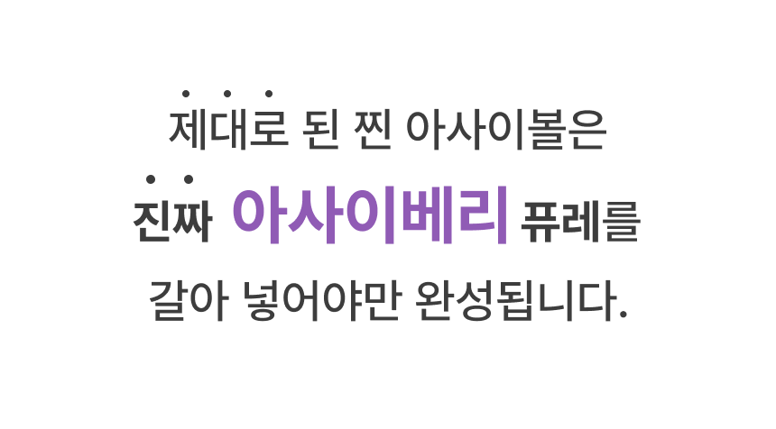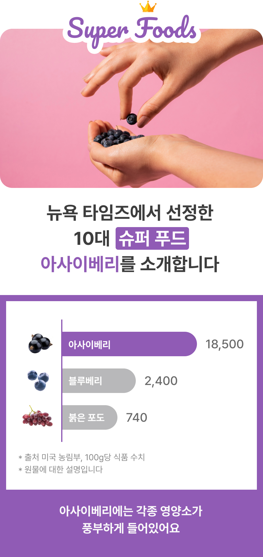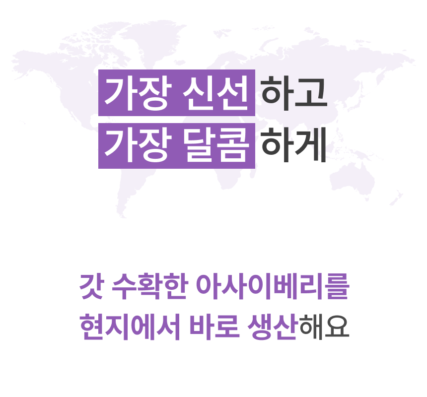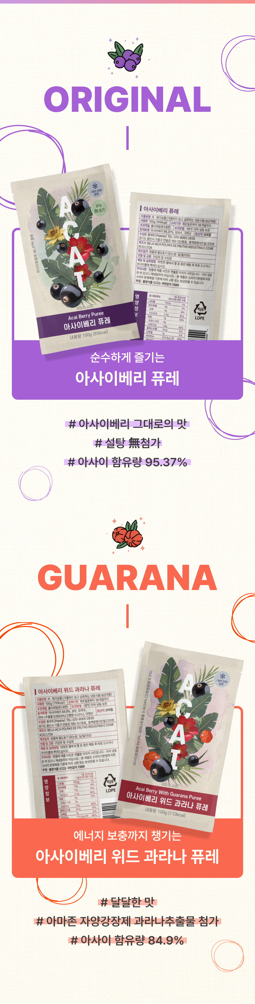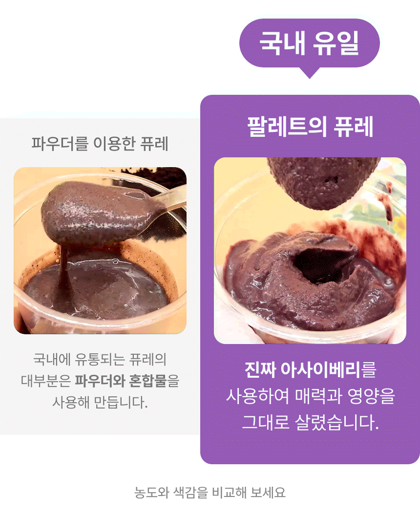 A. 신선한 아사이베리는 채집 후, 시간이 지날시 산화되어 가공이 필요합니다. 때문에 모든 아사이베리 식품은 12시간 이내에 가공되어 판매됩니다. 아사이베리 파우더는 상온보관이 가능해지지만 특유의 매력과 풍미를 완전히 담지 못하며, 아사이베리 퓨레는 매력을 그대로 전달할 수 있는 방법입니다.