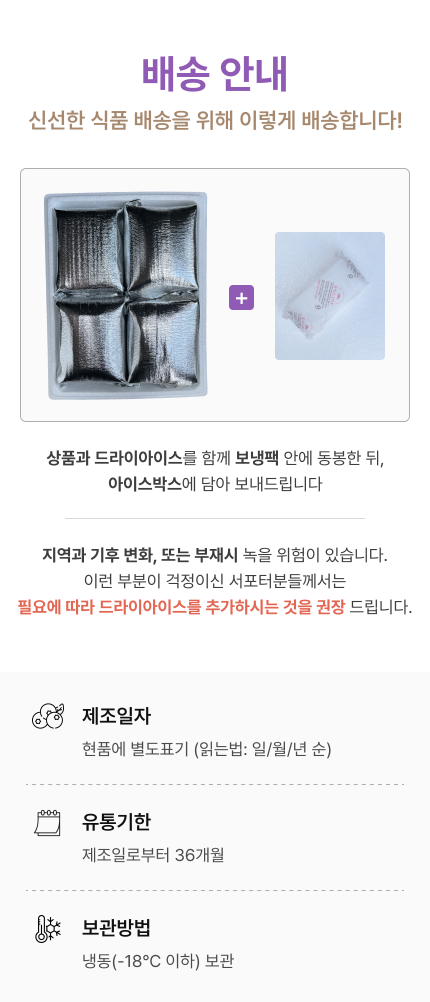 A. 최대한 빠르게 배송 드리오나, 택배사 상황에 따라 약간의 지연이 있을 수는 있습니다. 하지만 냉동된 퓨레 자체가 냉매효과가 있어 냉동상태가 오랫동안 유지됩니다. 만약 냉동상태를 확실히 하시고 싶으신 분은 드라이아이스를 추가하시는 것을 권장합니다. 특히, 여름철에는 드라이아이스 추가를 권장드립니다.