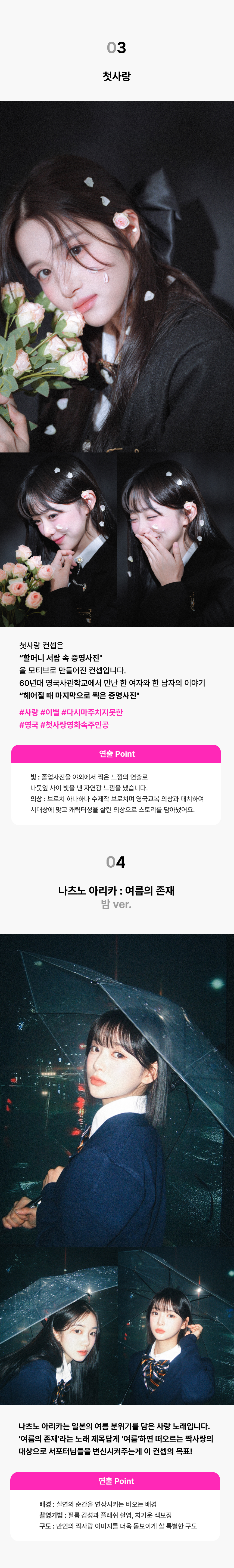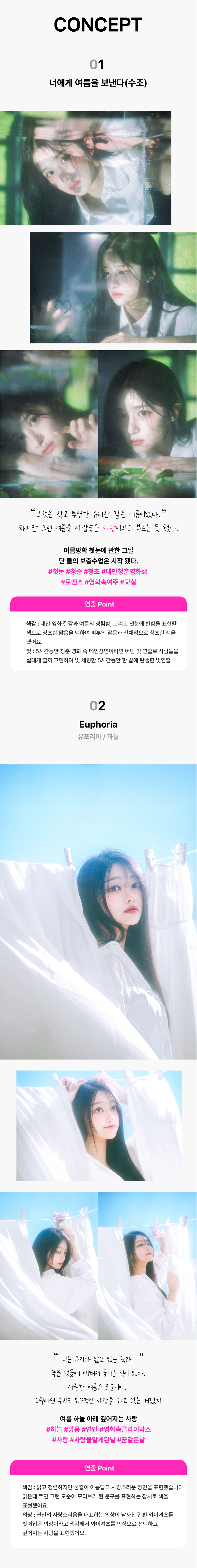 이번 와디즈 프리오더의 테마는 “여름 속 여주인공” 이라는 주제를 담아냈습니다. 가지각색의 사랑의 장면들을 제 해석을 담아서 표현을 했어요! 저는 사진은 이 시와 같다고 생각을 합니다. 한 사진에 함축적인 의미를 전달하는 사진은 하나의 시이기도 합니다. 서포터분들께 제가 좋아하고 들려주고 싶었던 사랑의 이야기들을 이번 기회에 표현했습니다. 그 이야기 속의 여주인공으로 만들어 드릴게요 :)