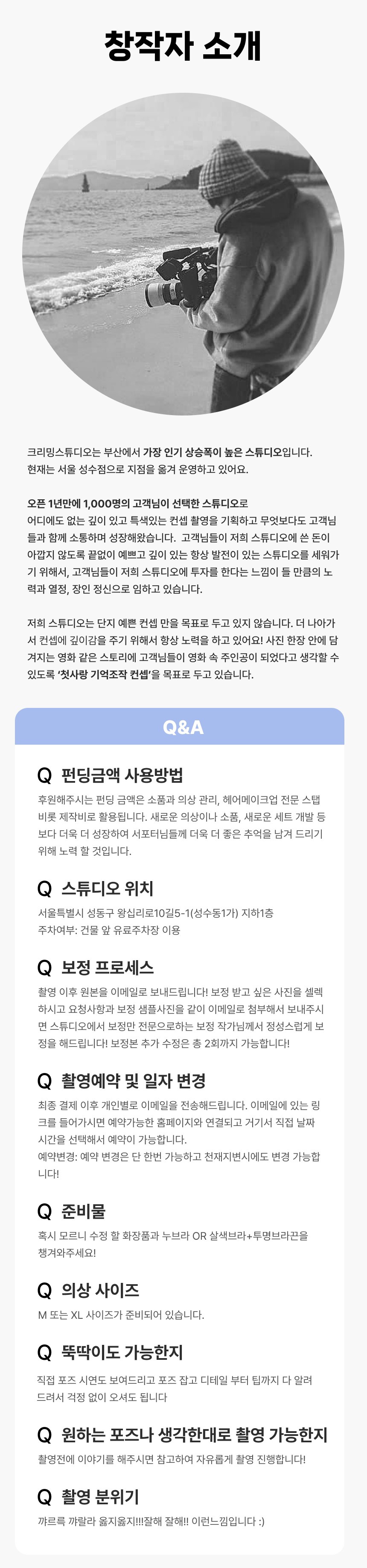 크리밍 스튜디오를 사랑해주시고, 아껴주시는 와디즈 서포터님들께 영화 속 주인공으로 여러분을 초대하고 싶었습니다. 와디즈를 통해 더욱 다양한 분들이 마음속에 꿈꾸는 여주인공의 모습을 마음껏 뽐낼 수 있게 마음속 한 켠에 담아주셨던 여주인공이라는 유리상자를 꺼낼 수 있도록 그 찰나의 아름다움을 기록해드리고자 합니다.