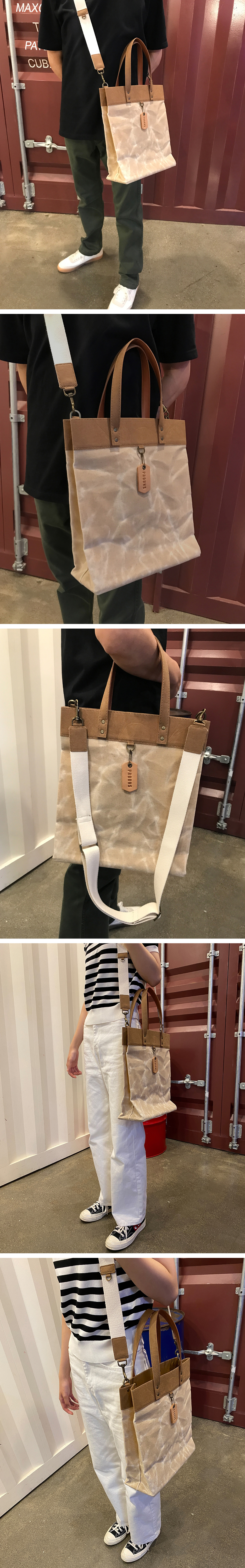 메이커는 물건을 사면 담아주는 종이 쇼핑 백을 모으는 습관이 생겼습니다. 각각의 쇼핑 백마다 크기도 조금씩 다르고 재질이나 마감 방법의 차이도 보이고 특히, 한 번 쓰고 버리기 아까운 마음도 들기 때문인데요. 납작하게 접어두면, 부피도 적게 차지하여 겹겹이 모아둔 종이 백은 필요할 때 꺼내서 유용하게 쓰곤 했지요. 그러나, 종이 쇼핑 백의 아쉬운 점이라면, 쉽게 찢어지고 헤지는 것인데요. 소개해 드리는 '프라운스 텍슨 캔버스 토트백'은 '종이 쇼핑백의 디자인 감성을 고스란히 이어받았지만 절대 종이 쇼핑백 아닌, 급을 뛰어넘는 프리미엄 감성'을 갖춘, 패셔 너블한 워너비 토트백입니다.