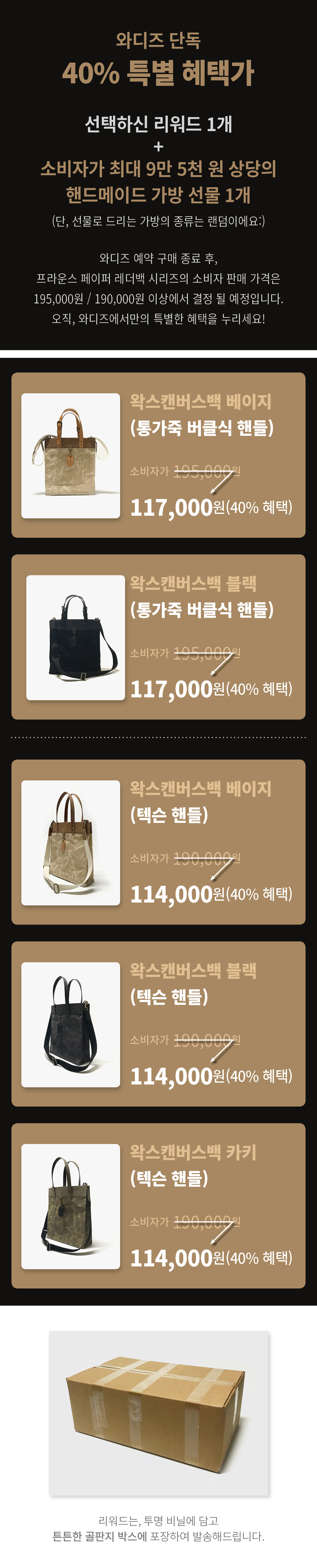'왁스캔버스백 베이지(통가죽 버클식 핸들)', '하드캔버스백 블랙(통가죽 버클식 핸들)', '왁스캔버스백 베이지(텍슨 핸들)', '왁스캔버스백 블랙(텍슨 핸들)', '왁스캔버스백 카키(텍슨 핸들)'리워드들은, 와디즈 프리오더 진행 기간과 리워드 발송 완료 이후 7일 이상, 자사몰을 포함하여 국내외 어디에서도 만나보실 수 없는 와디즈 서포터 분들만을 위해 오직 와디즈에서만 국내 단독 유통되는 희소성 있는 리워드입니다. 편안하고 자유로운 나만의 연출을 위해, 새로운 방식으로 유니크하게 잘 만든 프라운스 왁스캔버스 토트백 시리즈를 만나볼 수 있는 이번 기회를 놓치지 마세요 :)