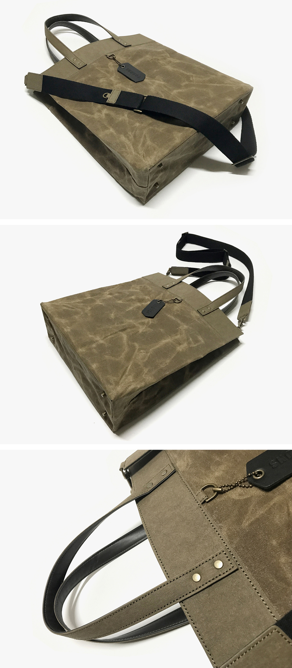 〈가방 제작 공정에서 자연스럽게 생기는 크랙, 카키 색상의 왁스 캔버스 원단〉