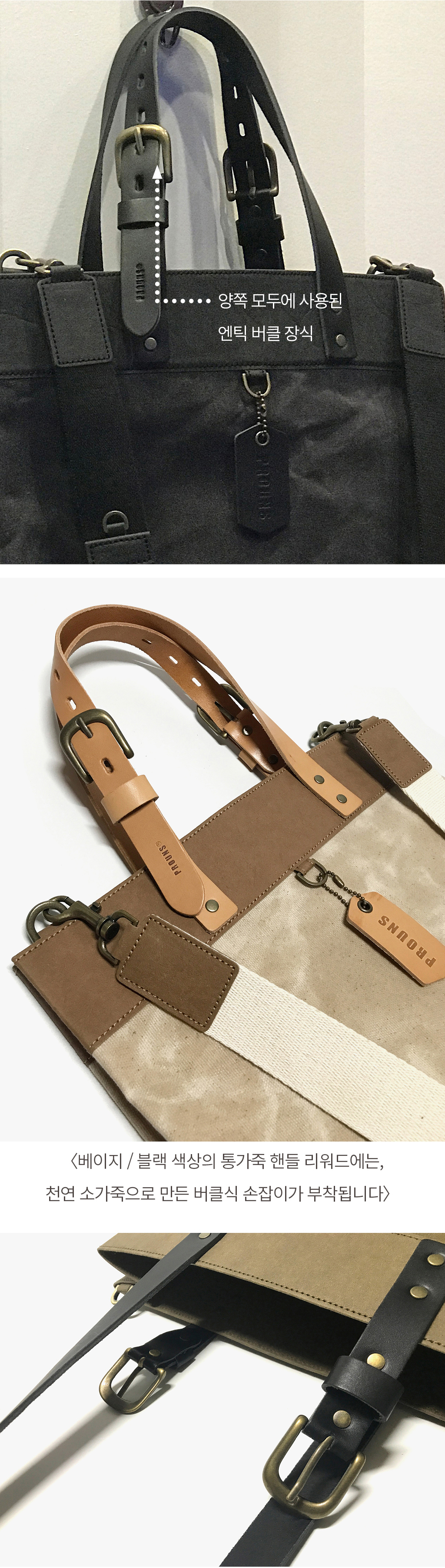 프라운스 텍슨 왁스캔버스 토트백의 손잡이는, 양쪽 모두 3mm 두께의 검은색 고급 천연 통가죽과 엔틱 금속 소재의 버클로 만들어졌습니다. 때로는 토트백으로 때로는 숄더백으로 자유로운 연출이 가능한 빈티지 룩이 돋보이는 유니크한 디자인이지요.
