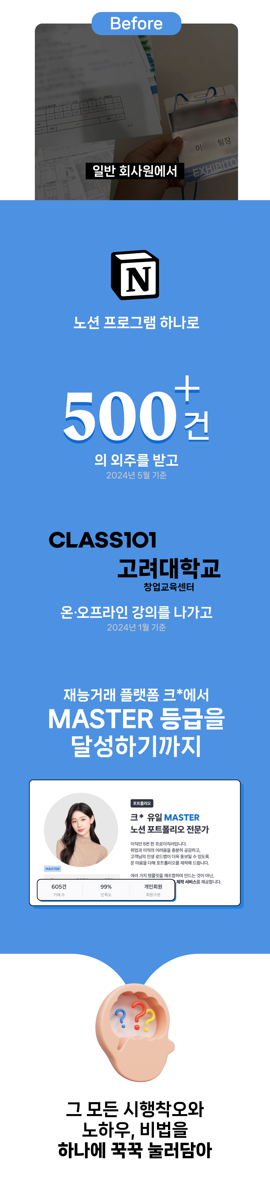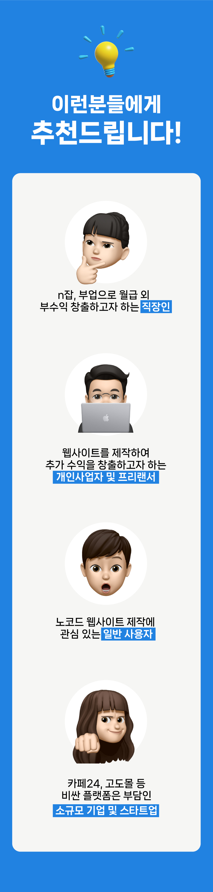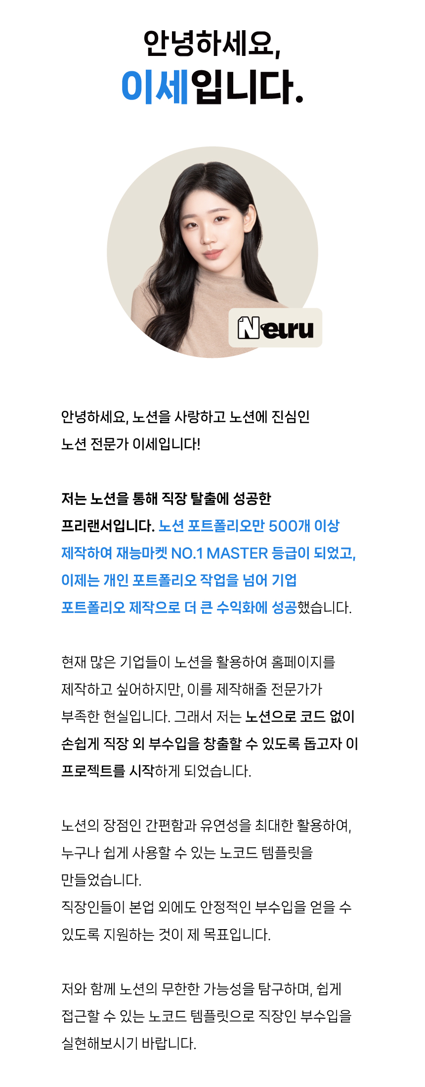 노션을 통해 누구나 쉽게 기업 홈페이지를 제작하고, 부수입을 창출할 수 있는 <노코드 템플릿>을 제공합니다.