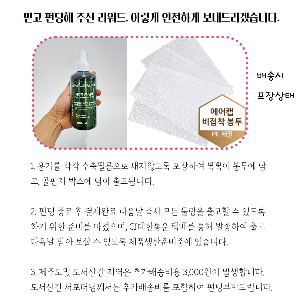 모금된 소중한 펀딩액은 가발복구유연제 리워드 물량 확보를 위한 생산 및 각종 비용으로 사용될 예정입니다.