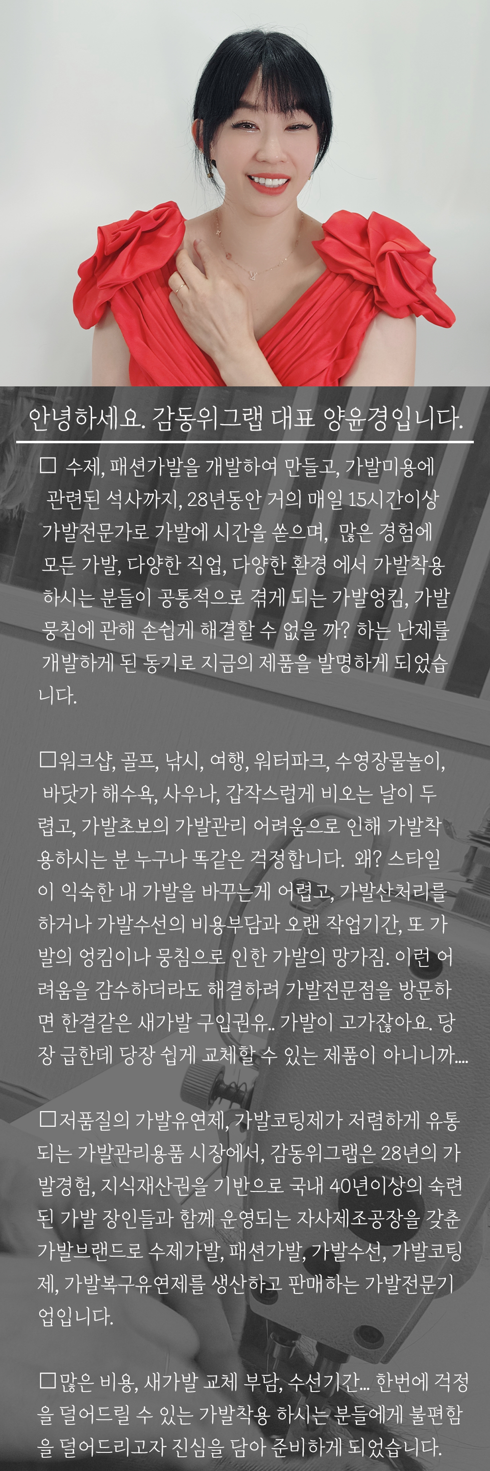 저희의 감동위그랩을 지지해주시고 응원을 보내주시는 오랫동안 가발을 착용하면서 애로사항을 말씀해주셨던 많은 가발고객님과 헤어피스, 붙임머리나 가발을 착용하는 모든 분, 탈모로 고민이 많으신 분들이 주시하고 있는 와디즈에서 저희의 도전을 가장 먼저 선보이고 싶었습니다. 탈모로 인해 고통받으시는 분, 붙임머리나, 가발과 함께 삶을 공유하는 모든 분들과 계속 함께 하기를 소망합니다.