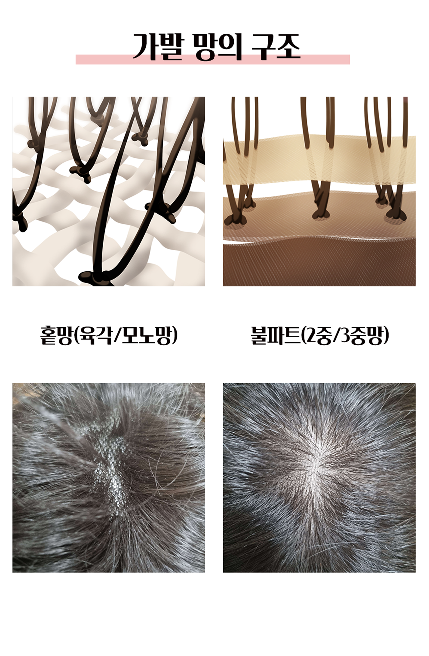가발은 만들어지는 방법에 따라 가발의 뭉침과 엉키는 정도가 제품마다 각기 다릅니다. 불파트 제품은 매듭이 망안에 숨겨져있어 매듭이 안보이기때문에 뿌리쪽은 잘 안 엉키나, 모발끝이 거칠어지고, 홑망은 매듭이 보이는 구조로 만들어졌기때문에 주로 뿌리(매듭부분)이 엉키고 뭉칩니다.