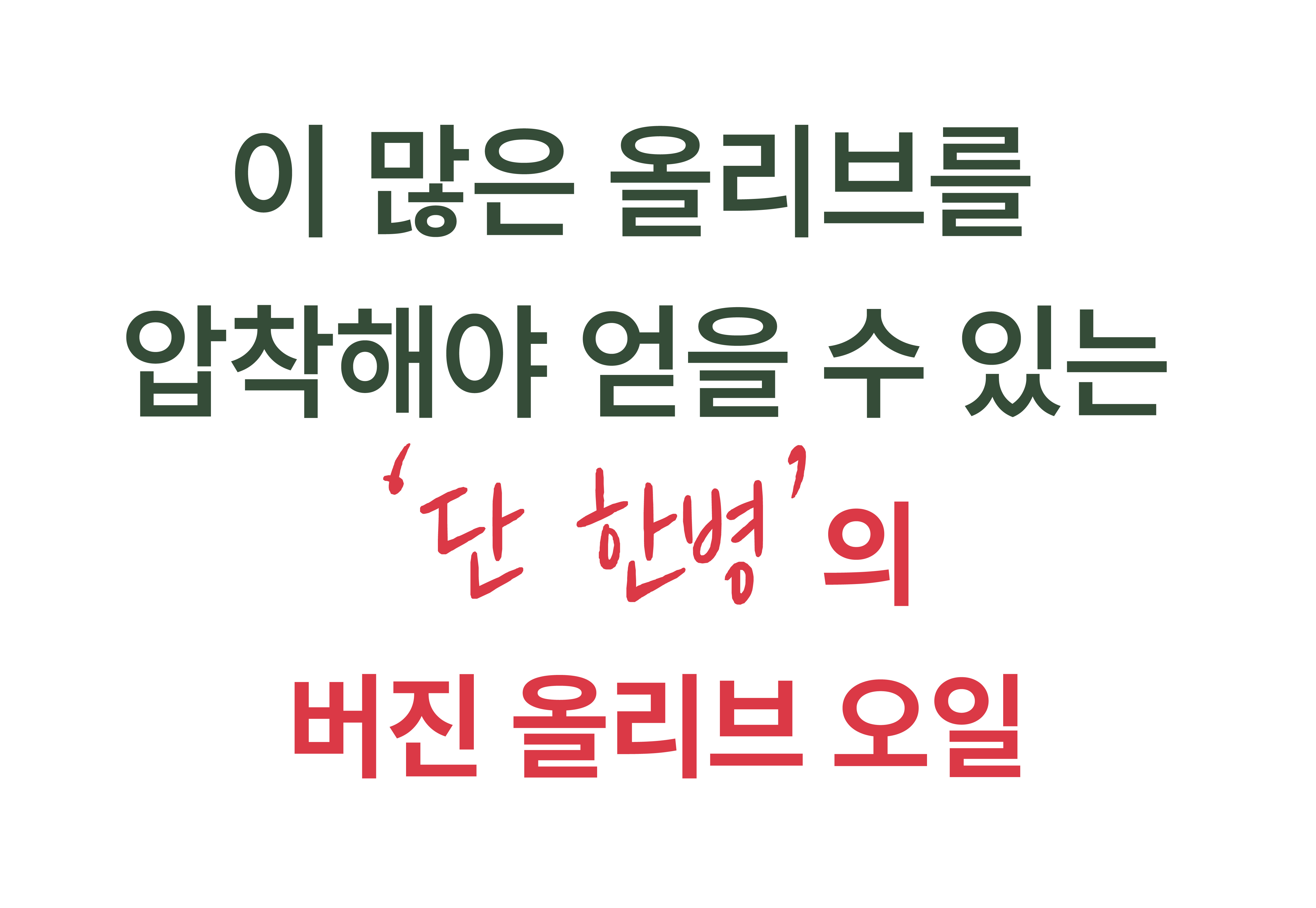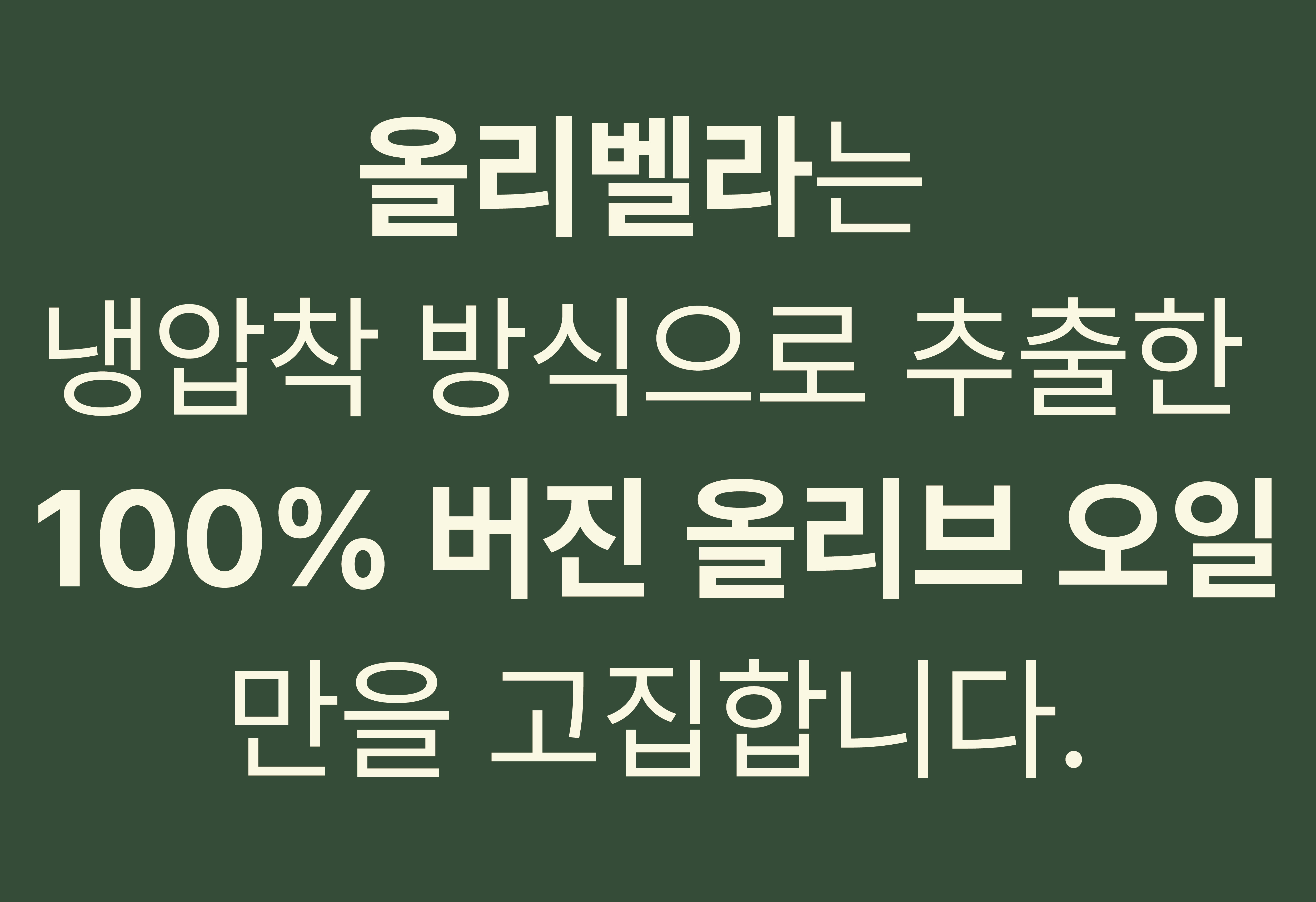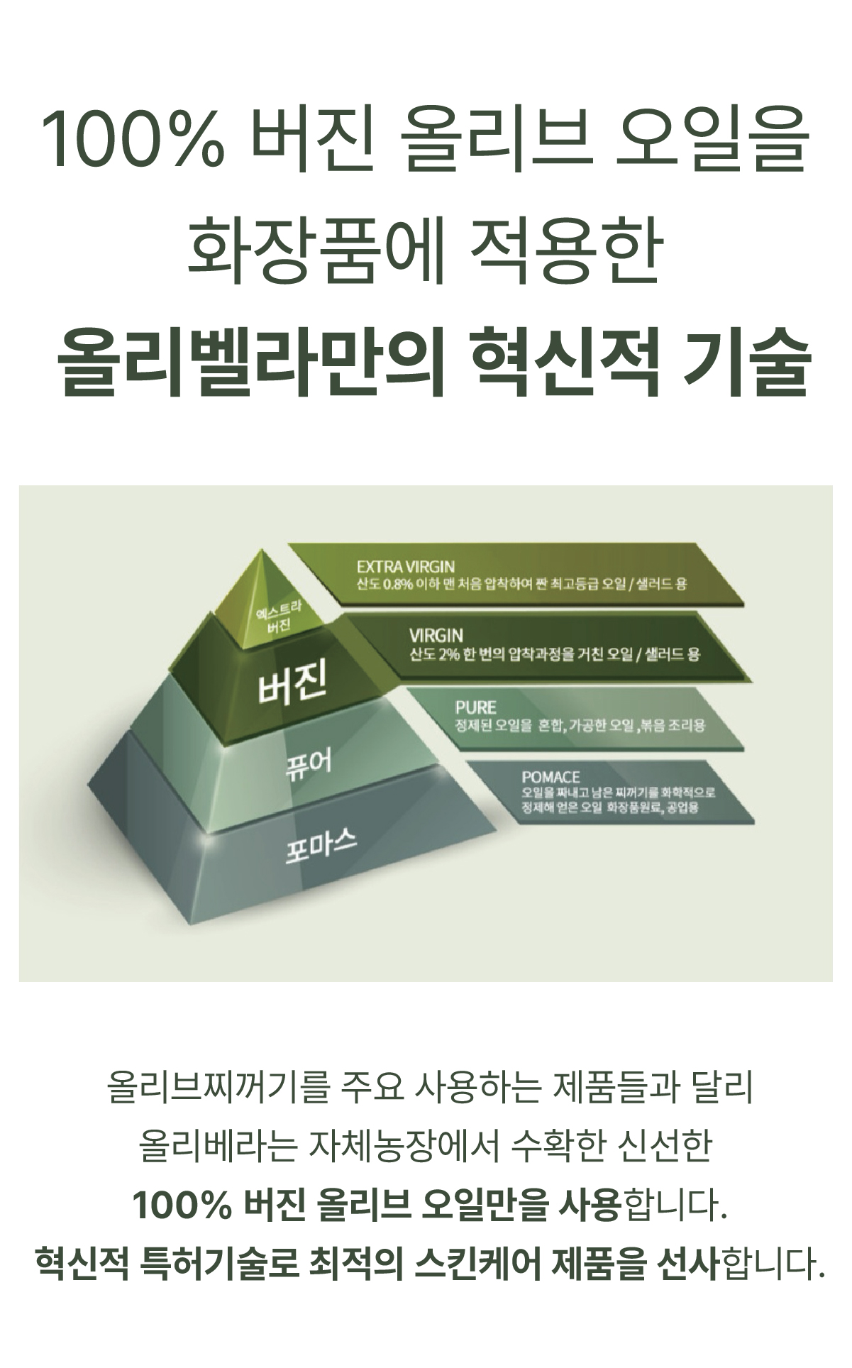 <THE ONE & ONLY 100% 버진올리브 오일> 이 캐치 프레이즈 안에 정말 많은 의미가 담겨있습니다. 올리벨라 제품의 장점은 바로 원료 그 자체입니다.