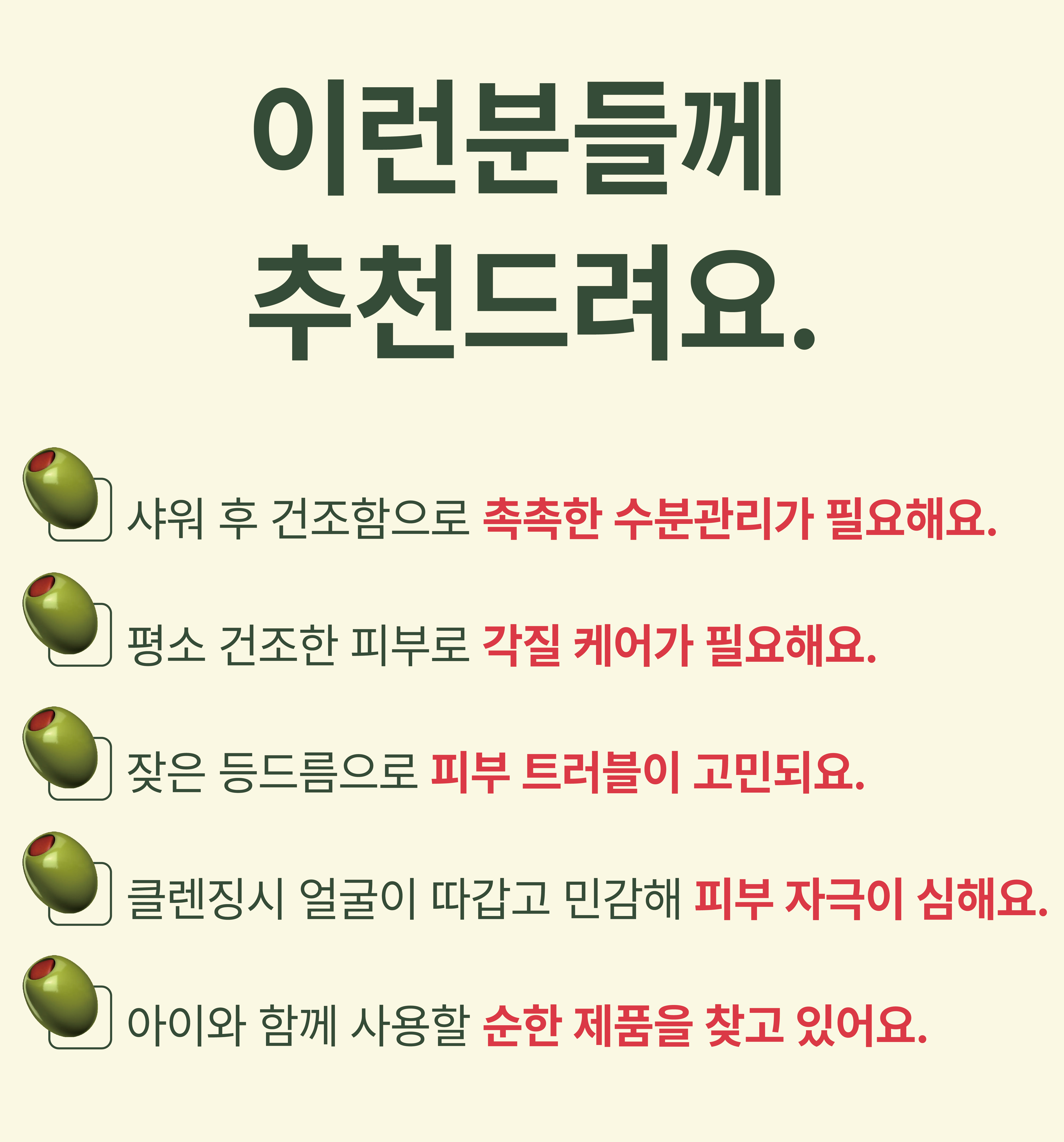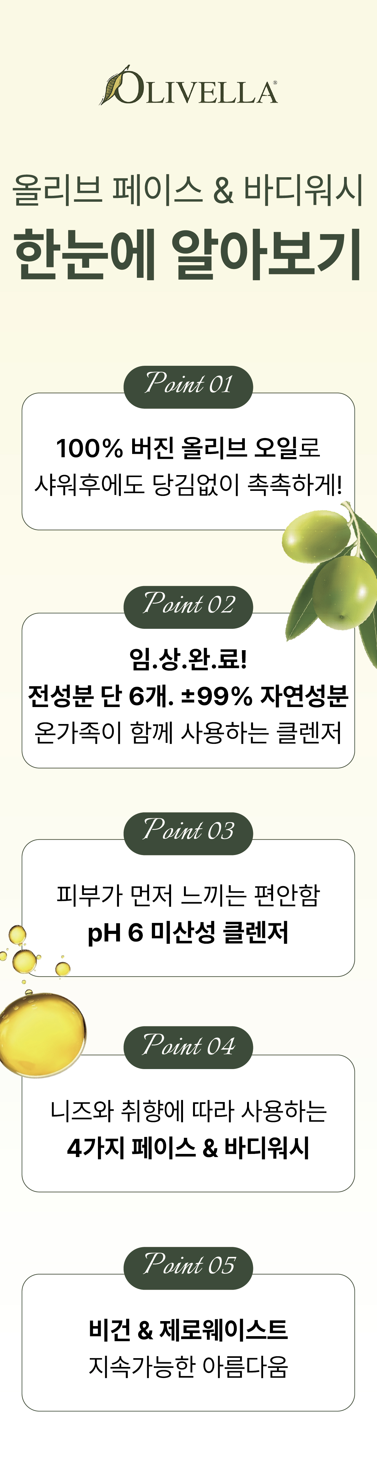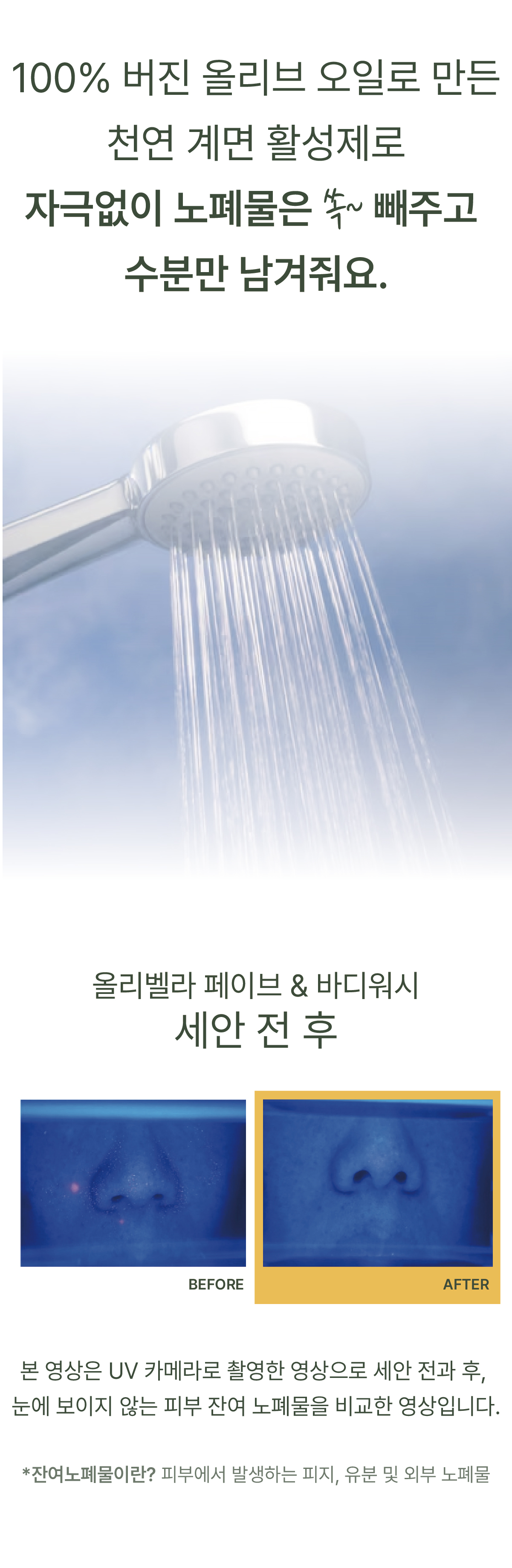 A. 올리벨라의 주 세정성분은 올리브유로 만든 포타슘올리베이트 입니다. Ph 약산성 성분으로 피부 자극을 줄였습니다.