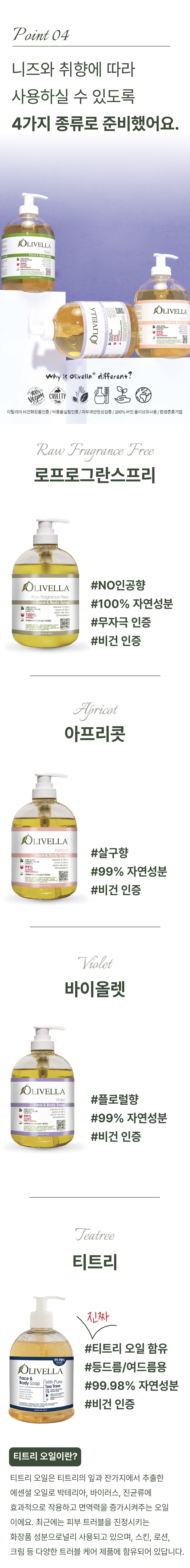 A. 올리벨라 페이스 바이 리퀴드 솝은 The one & only 100% virgin olive oil 라는 모토하에 엄격한 심사를 거친 100% 버진 올리브 오일만을 선별하여 사용합니다. 단가를 맞추기 위한 낮은 등급의 올리브오일은 사용하지 않았습니다